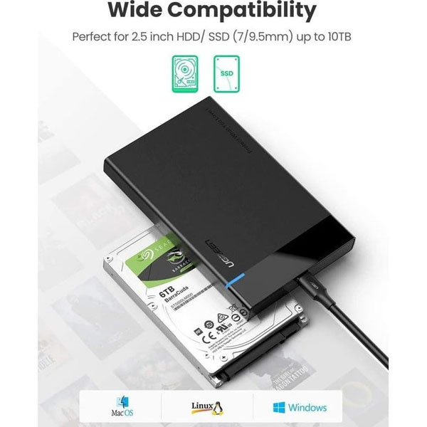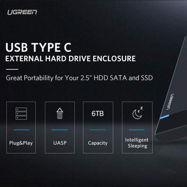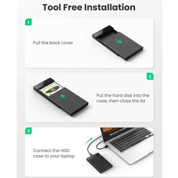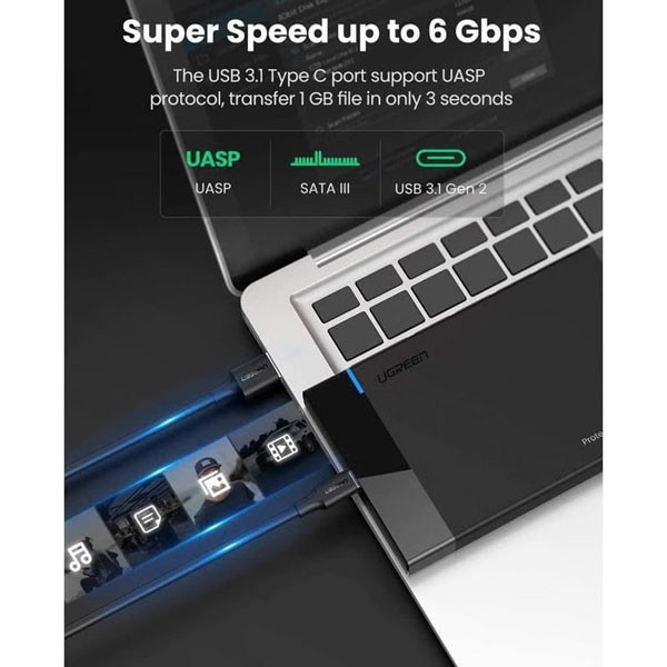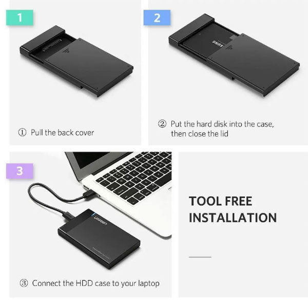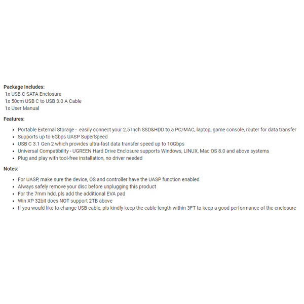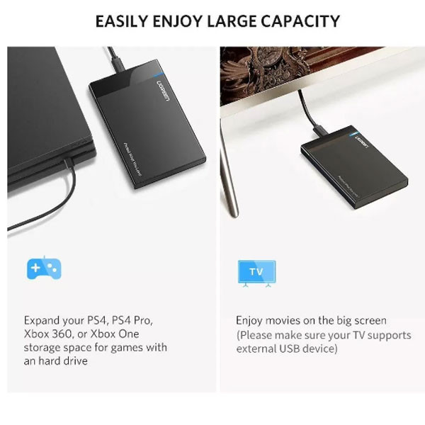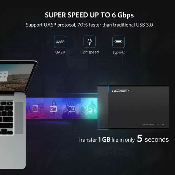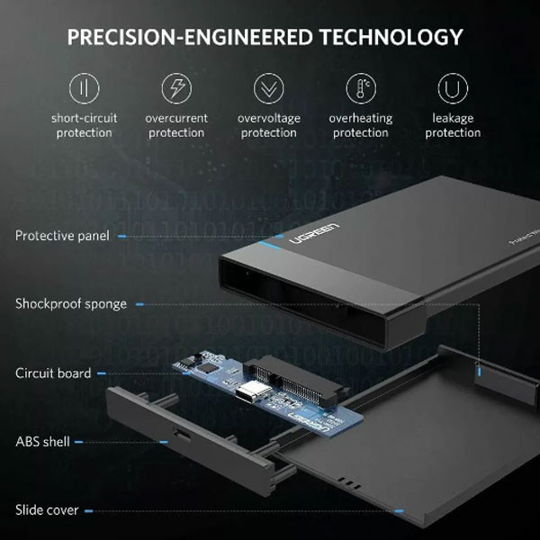 قاب هارد اکسترنال 2.5 اینچ یوگرین مدل US221-50743 محصولی از شرکت «یوگرین» (UGREEN) است . بدنه این محصول از پلاستیک ABS ساخته شده است که از استحکام خوبی برخوردار است. این قاب به صورت کشویی باز میشود ، به این ترتیب برای قرار دادن هارد در آن نیازی به استفاده از پیچ نیست . قاب هارد اکسترنال 2.5 اینچ یوگرین مدل US221-50743 علاوه بر هارد دیسکها از حافظههای SSD هم پشتیبانی میکند . برای استفاده از این قاب حافظه کافی است که هارددیسک 2.5 اینچی با ضخامت حداکثر 9.5 میلیمتری خود را در محل تعبیه شده قرار دهید وبه کمک درگاه USB آن را به رایانه خود متصل کنید. با استفاده از این محصول میتوانید حافظههای با ظرفیت بالا را خریداری کرده و از این طریق آنها را به هارد اکسترنال تبدیل کنید . گفتنی است این محصول در برابر جریان ، ولتاژ و حرارت بیش از حد محافظت شده است . برای محافظت بیشتر از HDDها و SSDها درون این قاب از کوسنهای اسفنجی استفاده شده که میتواند کاملا موثر و تاثیرگذار باشد.