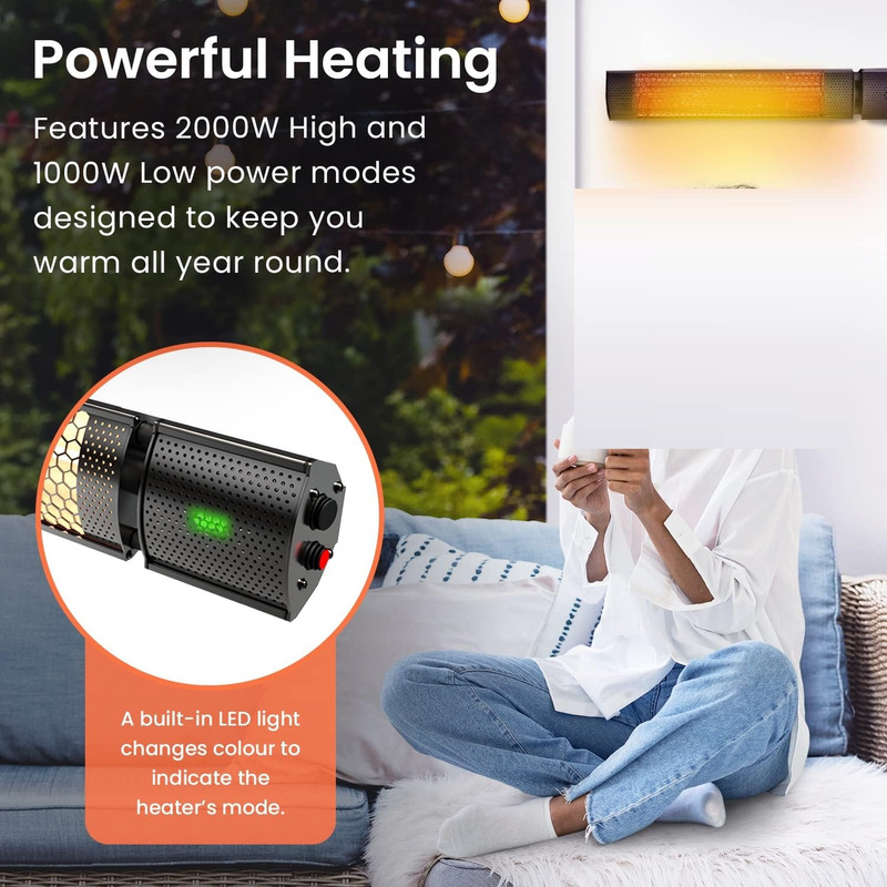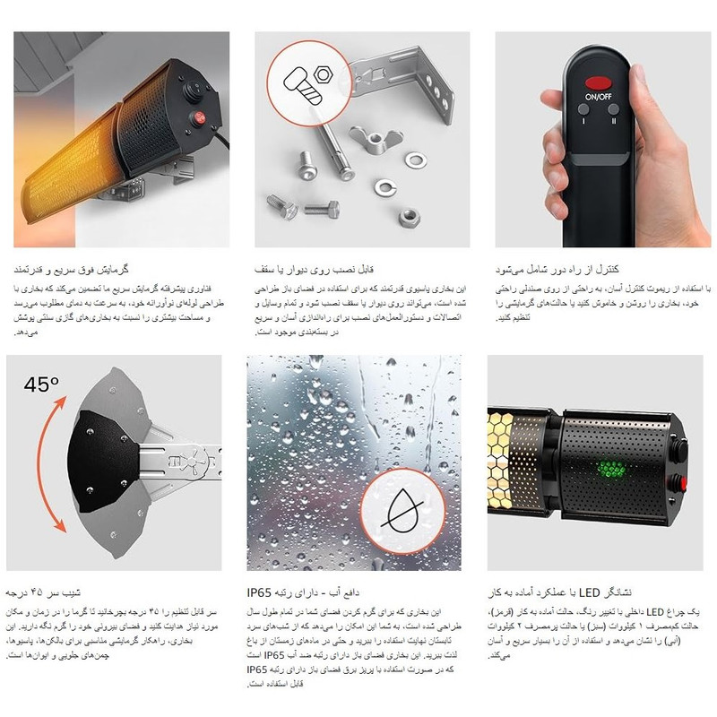 | سایر توضیحات | بخاری برقی دیواری هالوژنی مادون قرمز پرو بریز - با کنترل از راه دور برای باغ/فضای باز - 2 حالت گرمایش (1 کیلووات و 2 کیلووات) . گرمایش قدرتمند فضای باز: این بخاری مادون قرمز Pro Breeze برای پاسیو و باغ، دارای دو تنظیم گرمایش سریع شامل حالتهای کممصرف ۱۰۰۰ وات (۱ کیلووات) و پرمصرف ۲۰۰۰ وات (۲ کیلووات) است. سقفی یا دیواری: تمام وسایل و اتصالات به همراه دستورالعملهای آسان برای دنبال کردن ارائه میشوند که به شما امکان میدهد این بخاری مادون قرمز قدرتمند را روی دیوار یا سقف فضای باز نصب کنید. طراحی شده برای استفاده در فضای باز: این بخاری لامپی فضای باز به طور دقیق در شرایط آب و هوایی سخت آزمایش شده و رتبه IP65 را کسب کرده است، که استفاده از آن را در فضای باز با سوکت فضای باز دارای رتبه IP65 ایمن میکند. فضای گرمایشی بزرگ: طراحی لولهای بسیار بزرگ این بخاریها به گونهای است که فضای بیرون را در تابستان و زمستان گرم نگه میدارد و فضای بزرگتری را نسبت به بخاریهای گازی فضای باز گرم میکند و نسبت به شومینههای روباز، سازگارتر با محیط زیست است. بخاری پاسیوی مادون قرمز هالوژن پرو بریز ،قابل نصب روی دیوار یا سقف، با ۲ حالت گرمایش و کنترل از راه دور ، این بخاری مادون قرمز قدرتمند پاسیو از Pro Breeze دارای فناوری گرمایش فوق سریع و دو حالت گرمایش قدرتمند شامل حالت کم مصرف ۱۰۰۰ وات (۱ کیلووات) و حالت پرقدرت ۲۰۰۰ وات (۲ کیلووات) است. طراحی لولهای بسیار بزرگ آن، مساحت گرمایش بیشتری نسبت به بخاریهای گازی سنتی فراهم میکند. این بخاری پاسیو را میتوان به هر دیوار یا سقف فضای باز نصب کرد، به همراه دستورالعمل نصب و تمام وسایل و اتصالات. یک کنترل از راه دور با کاربری آسان نیز ارائه میشود. دارای درجه ضد آب IP65.محافظت در برابر گرمای بیش از حد : بله (۸۰ درجه سانتیگراد)،نوع :لامپ هالوژن طلایی مادون قرمز |