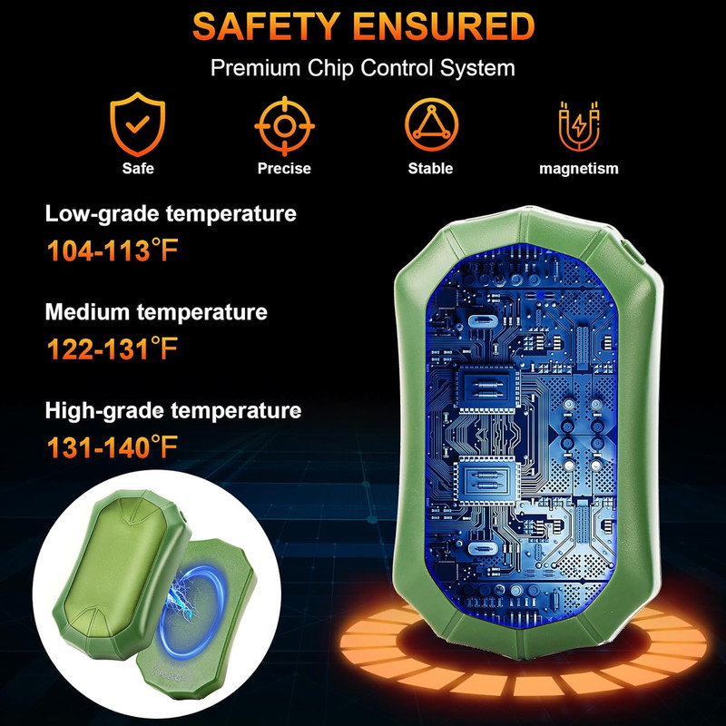 3 حالت تنظیم گرما. محدوده دمای پایین از 41 تا 42 درجه سانتیگراد، محدوده دمای متوسط از 49 تا 51 درجه سانتیگراد، محدوده دمای بالاتر از 59 تا 62 درجه سانتیگراد، که 10 تا 15 ساعت گرما فراهم میکند. مناسب برای ورزشهای زمستانی در فضای باز، رفت و آمد در هوای سرد، پیادهروی سگ یا کار در شرایط سرد - گرم نگه داشتن دستان شما در هر زمان و هر مکان.