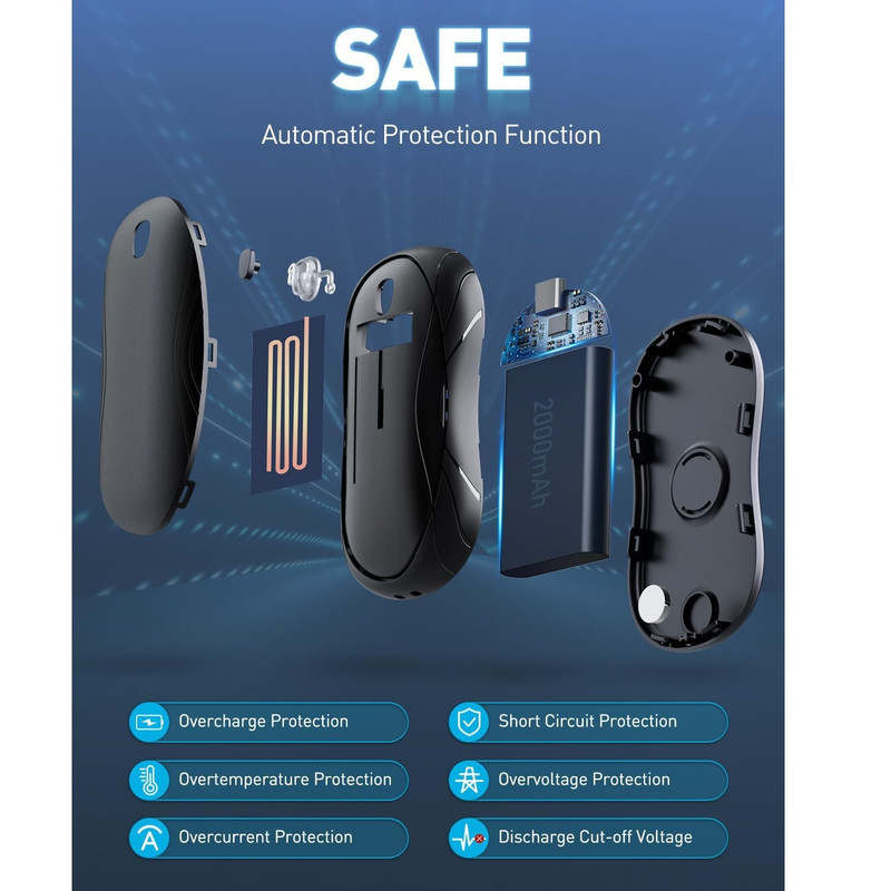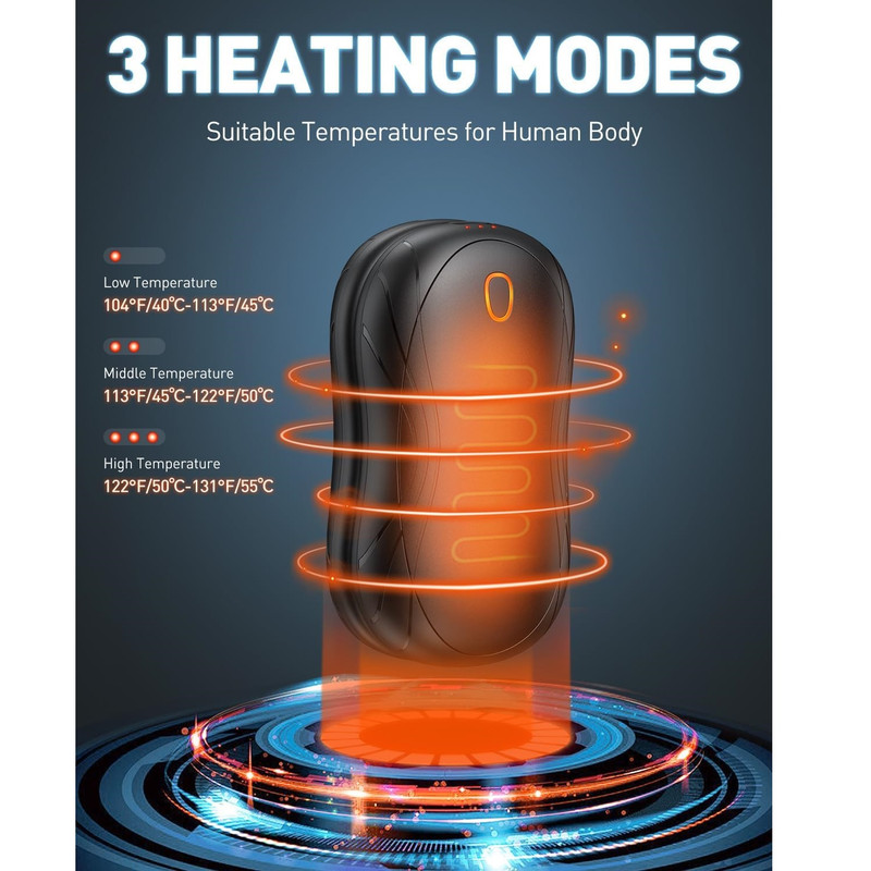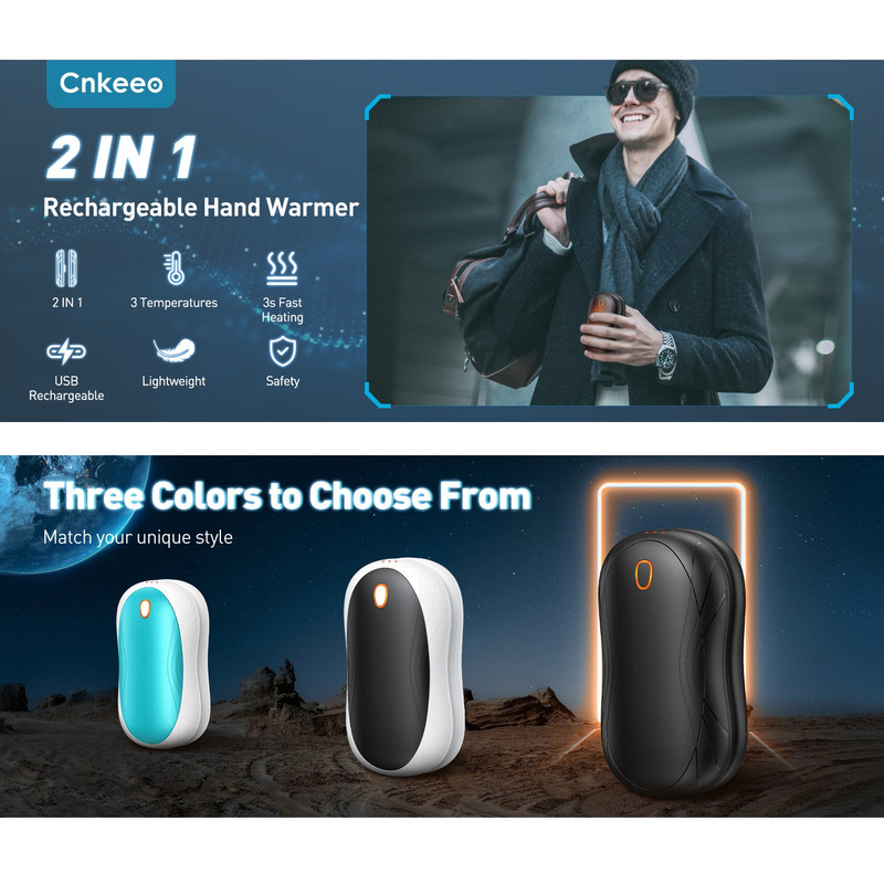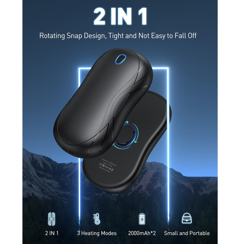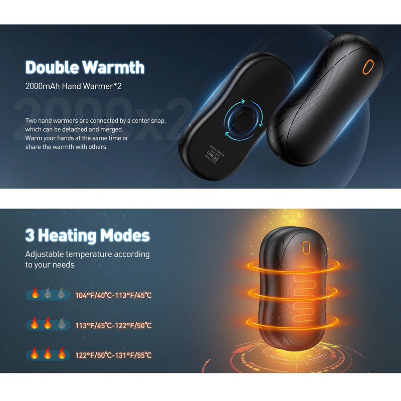 ویژگی ها گرمایش سریع در عرض 3 ثانیه : قابلیت استفاده مجدد و گرمایش سریع، این گرم‌کن دستی را به یک بخاری جیبی قابل حمل ضروری در زمستان برای فعالیت‌های خارج از منزل - سفر، ماهیگیری، پیاده‌روی، کمپینگ، اسکی، پیاده‌روی سگ در هوای سرد و غیره - تبدیل می‌کند. ۶-۱۰ ساعت زمان کاری: این گرم‌کن دست مجهز به یک باتری قابل شارژ داخلی ۲۰۰۰ میلی‌آمپر ساعتی است که می‌تواند ۶ تا ۱۰ ساعت کار کند. می‌توانید هر دو گرم‌کن دست را به طور همزمان با کابل ۲ در ۱ نوع C شارژ کنید. شارژ کامل تنها ۳ تا ۴ ساعت طول می‌کشد.
