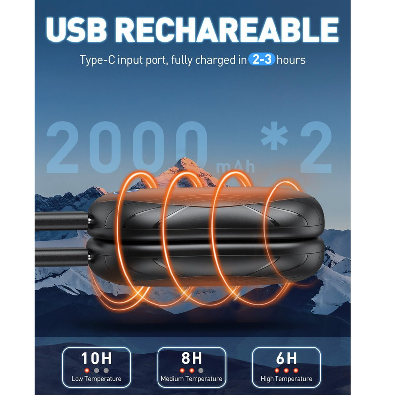 ویژگی هاگرمایش سریع در عرض 3 ثانیه : قابلیت استفاده مجدد و گرمایش سریع، این گرم‌کن دستی را به یک بخاری جیبی قابل حمل ضروری در زمستان برای فعالیت‌های خارج از منزل - سفر، ماهیگیری، پیاده‌روی، کمپینگ، اسکی، پیاده‌روی سگ در هوای سرد و غیره - تبدیل می‌کند. ۶-۱۰ ساعت زمان کاری: این گرم‌کن دست مجهز به یک باتری قابل شارژ داخلی ۲۰۰۰ میلی‌آمپر ساعتی است که می‌تواند ۶ تا ۱۰ ساعت کار کند. می‌توانید هر دو گرم‌کن دست را به طور همزمان با کابل ۲ در ۱ نوع C شارژ کنید. شارژ کامل تنها ۳ تا ۴ ساعت طول می‌کشد.