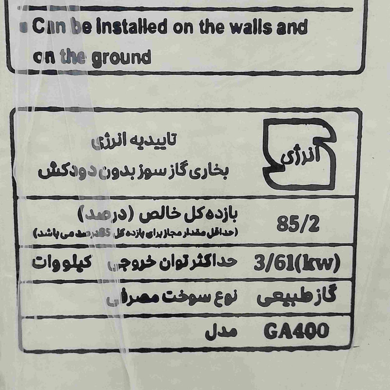| سایر توضیحات | *مجهز به سیستم کنترل اکسیژن (ODS)* مجهز به گاورنر تثبیت کننده فشار گاز ورودی *مجهز به جرقه زن کنترل حرارت از کم تا زیاد* بدون نیاز به دودکش قابل نصب روی دیوار و روی زمین*نوع شیر کنترل نیمه اتوماتیک |