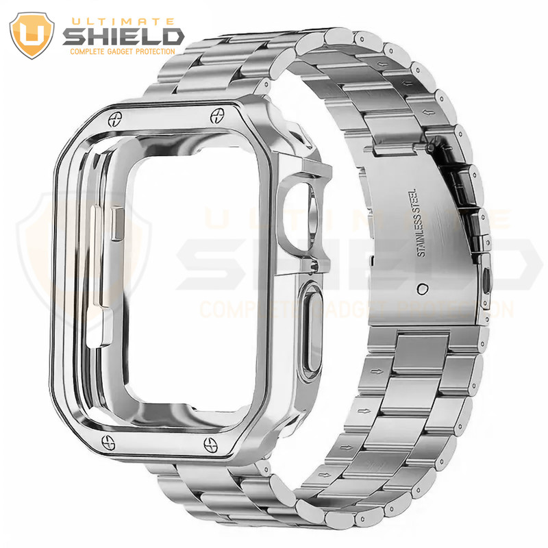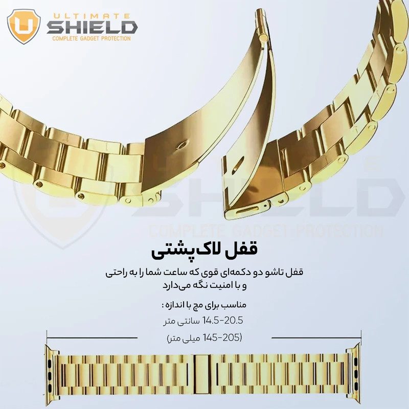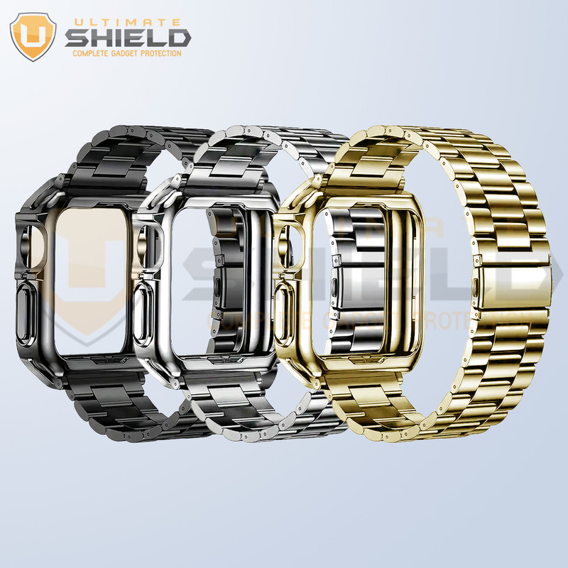 بند آلتیمیت شیلد مدل 3BLX به همراه کاور برای کاربرانی است که از استایل تکراری ساعت خود خسته شدهاند. در واقع این محصول به اپل واچ شما استایل تازه و جدیدی میبخشد. این بند از جنس استیل ضد زنگ تهیه شده و ضد حساسیت است. این بند قفل پروانهای قدرتمندی دارد و پس از بسته شدن، ساعت به طور کامل روی مچ دست شما سوار میشود. البته دکمهای در بند طراجی شده که تنها با فشردن آن بند باز میشود. این بند برای انواع مچ دست مناسب است و تنها نیاز به تنظیم دارد. کاور ارسالی این محصول از جنس سیلیکون بوده و نرم و انعطاف پذیر است. ساختار این کاور باعث میشود در مقابل ضربه بسیار مقاوم باشد و در بلند مدت دوام زیادی داشته باشد. این کاور به طور دقیق برشکاری شده و به طور کامل اپل واچ شما را پوشش میدهد.