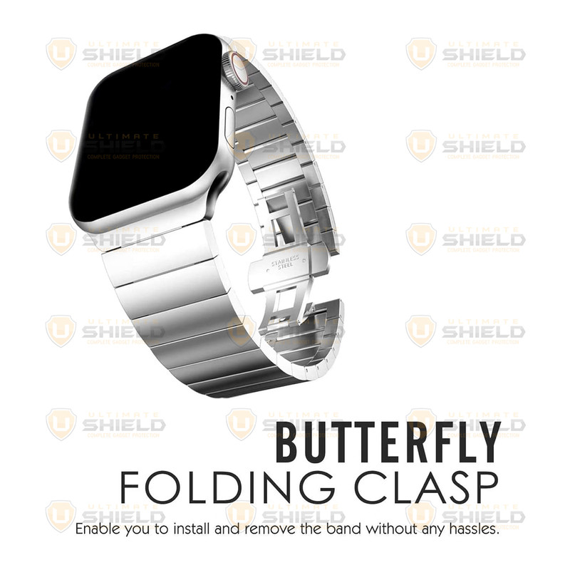 بند Butterfly link برای راحتی و بهبود استایل شما طراحی شده است. این بند از استیل ضد زنگ و بادوام ساخته شده و در مچ دست شما به بهترین شکل ممکن چفت میشود. این بند از سگک پروانهای تهیه شده که به سادگی بسته میشود و در کمترین زمان ممکن با فشردن دو دکمهی کناری سگک باز میشود.