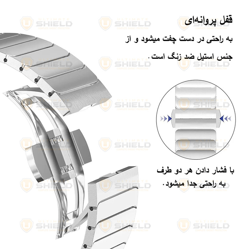 | توضیحات | سگک پروانهای - ظاهری شیک و کلاسیک - باز کردن بند با دو دکمهی کناری - بادوام و طراحی دقیق - قابل تنظیم برای انواع مچ دست |