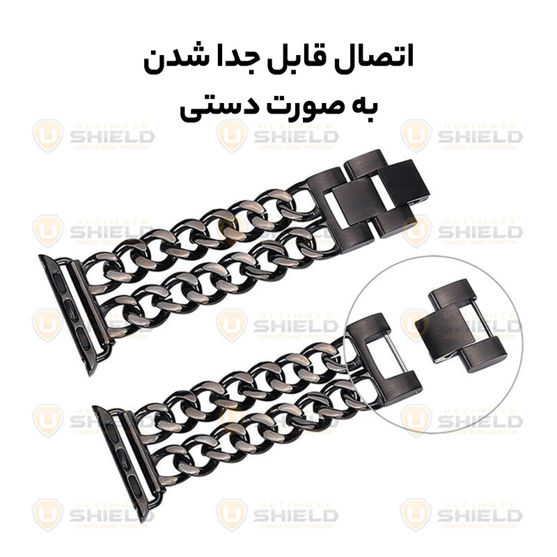 بند مدل CTR_2 انتخابی بسیار مناسب برای تغییر استایل اپل واچ شما به حساب می‌آید. این بند متشکل از دو زنجیر است و چند بست فلزی دارد که با استفاده از آن و بدون نیاز به هیچ ابزاری میتوانید اندازه‌ی بند را نسبت به مچ خود تنظیم کنید. این بند از جنس استیل ضد زنگ بوده و در دراز مدت رنگ خود را از دست نمیدهد. بند مدل CTR_2 کاملا ضد حساسیت بوده و آسیبی برای پوست ایجاد نمیکند. همچنین استیل به کار رفته در این بند ساختار با کیفیتی دارد و در عین حال وزن مناسبی دارد و روی مچ سنگینی نمیکند.