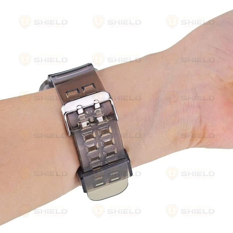 بند آلتیمیت شیلد مدل Transparent Shock از ترکیب سیلیکون نرم و TPU مقاوم ساخته شده و همزمان دوام بالا، راحتی و استایل اسپرت ارائه میدهد. طراحی یکتکهی این محصول باعث میشود نصب آن روی ساعت سریع و بیدردسر باشد و اتصال بند و کاور بهصورت ثابت و بدون لقزدن باقی بماند. کاور بدنهی ساعت را بهخوبی در برابر ضربه، خطوخش و گردوغبار محافظت میکند اما پوشش محافظی برای صفحهنمایش ندارد، که همین موضوع باعث حفظ کامل حساسیت لمسی و عملکرد روان تاچاسکرین ساعت میشود. بند سیلیکونی نیز با طراحی مشبک و قفل فلزی، تهویه مناسب، انعطافپذیری بالا و راحتی طولانیمدت را برای استفاده روزمره، ورزشی و شرایط پرتحرک فراهم میسازد. این ترکیب انتخابی مناسب برای کسانی است که بهدنبال محافظت همهجانبه و ظاهر حرفهای برای ساعت هوشمند خود هستند.