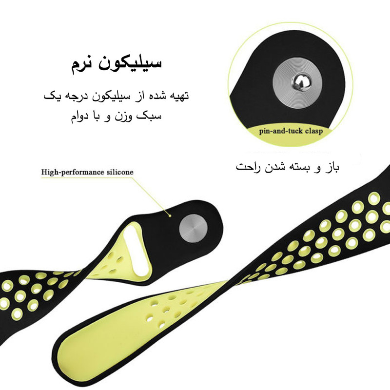 بند سیلیکونی NK_SIC با طراحی منحصربه‌فرد خود، انتخابی ایده‌آل برای افرادی است که به دنبال ترکیبی از راحتی و استحکام در بند ساعت خود هستند. این بند از سیلیکون باکیفیت ساخته شده و دارای حفره‌های ریز در سراسر سطح خود است که به تهویه مناسب و کاهش تعریق مچ دست کمک می‌کند. قفل این بند از نوع "pin and tuck" است که با قرار دادن پین در سوراخ مناسب و جمع‌کردن انتهای بند در زیر آن، ظاهری یکدست و مرتب به ساعت می‌بخشد. این طراحی نه‌تنها امنیت بالایی را فراهم می‌کند، بلکه از گیرکردن بند به لباس یا اشیاء دیگر جلوگیری می‌کند. بند سیلیکونی NK_SIC در رنگ‌های متنوعی عرضه می‌شود که امکان انتخاب بر اساس سلیقه شخصی را فراهم می‌کند. با استفاده از این بند، تجربه‌ای راحت و شیک در استفاده روزمره و فعالیت‌های ورزشی خواهید داشت.
