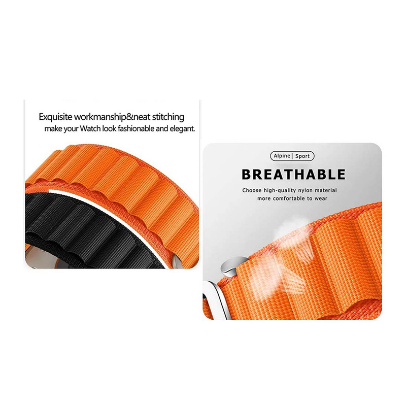 بند مدل Alpine سبک وزن، بادوام و قابل تنظیم، به طور یکپارچه از دو لایه پارچه، بدون دوخت بافته شده می باشد. از قلابهای تیتانیومی مقاوم در برابر خوردگی و بدون زنگ زدگی برای اتصال ایمن استفاده می کند. نوار ساخته شده از مواد نایلونی سازگار با پوست، نوارهای نایلونی کششی بافته شده، قابل تنفس، مقاوم در برابر عرق و مقاوم در برابر آب میباشد. همچنین با قلاب تیتانیوم G، سبک وزن میباشد. مناسب برای کوهنوردی، پیاده روی، دویدن، صخره نوردی، دویدن، دوچرخه سواری و سایر ورزش های ماجراجویی در فضای باز میباشد. بندهای طراحی شده برای ساعت اپل دارای یک هوک فلزی قابل تنظیم برای انعطاف پذیری و ایمن کردن بند شماست.