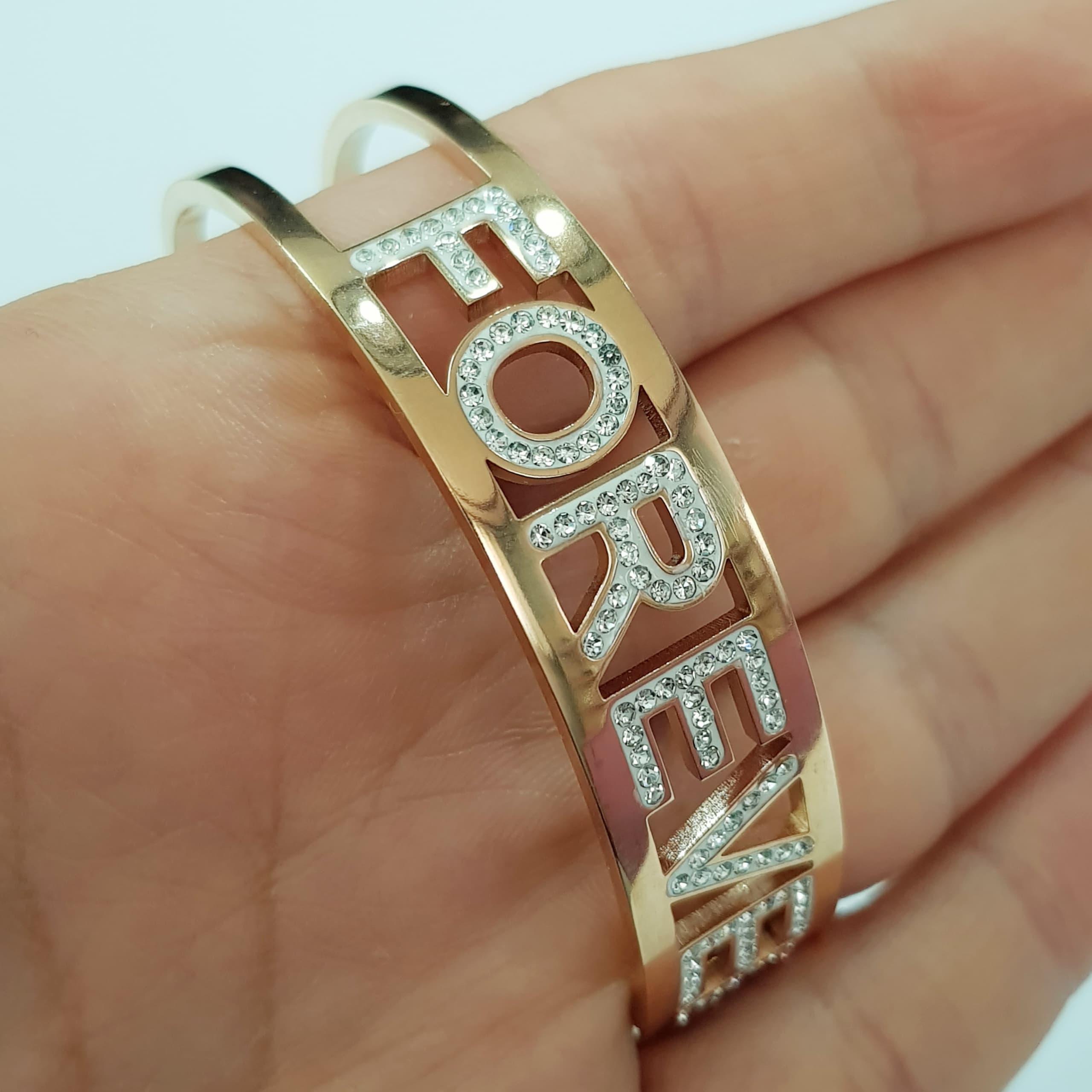 بنگل استیل طلایی طرح Forever فول نگین ، مهر استیل حک شده داخل بنگل ، کار ترند بسیار زیبا و جذاب برند forever ضد حساسیت