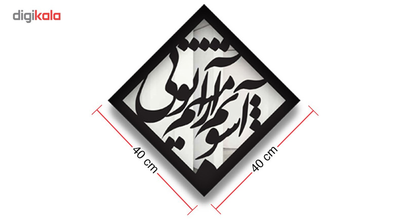 خط نستعلیق نشانهای بارز از طبع و سلیقه زیبایی شناختی ایرانیان است و بیشک زیباترین و ظریفترین خط در میان خطوط اسلامی است و قرار گرفتن آن در کنار آینه که از دیر باز در فرهنگ ایرانیان جایگاهی والا داشته لطافتش را دو چندان میکند. در اثر فوق ( آشوبم آرامشم تویی ) بر روی ام دی اف برش خورده و روی آینه قرار داده شده است.