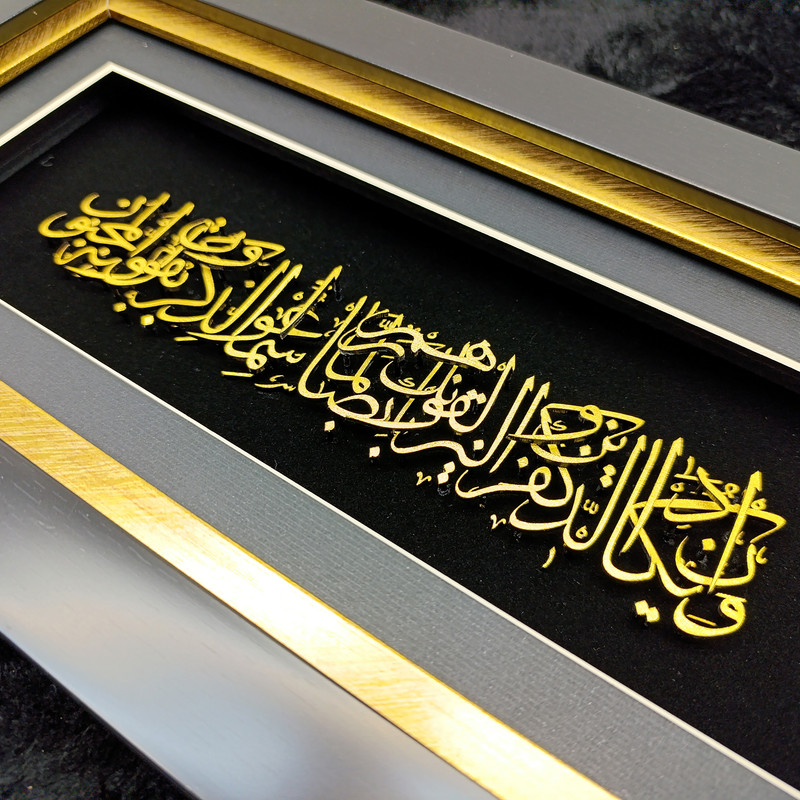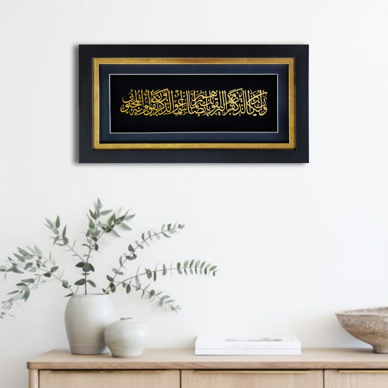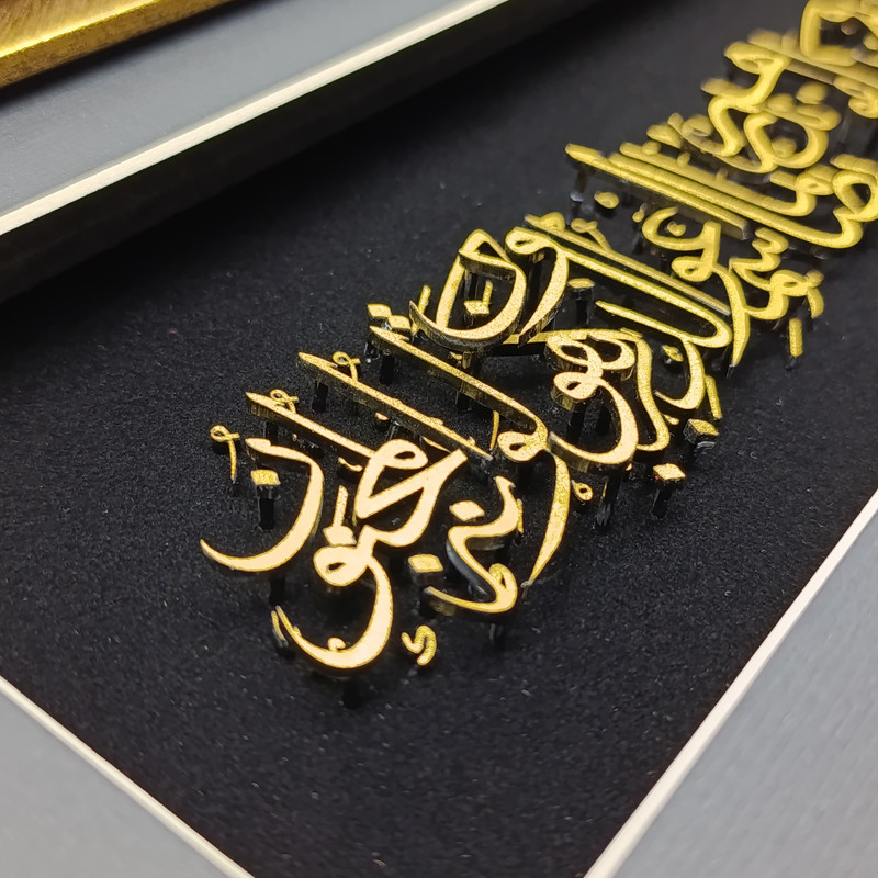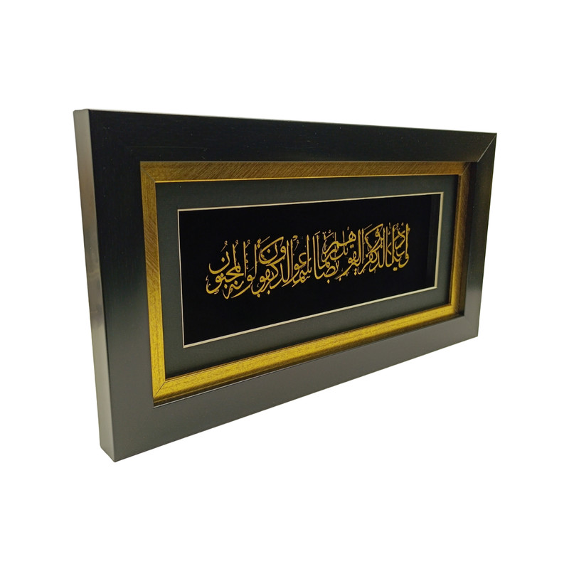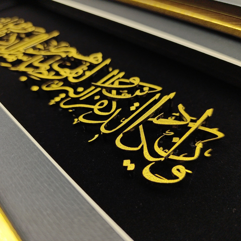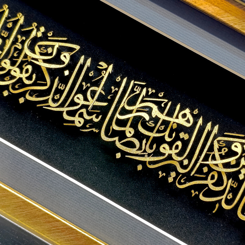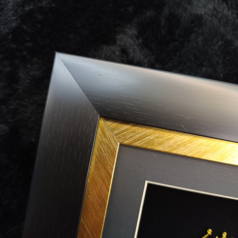 حروف و نقشها با روکش طلا کار شدهاند و در تضاد چشمنواز با پسزمینهی مشکی مخملی، درخششی خاص و جلوهای سهبعدی به خود گرفتهاند. ظرافت در طراحی خطوط عربی و توازن در ترکیببندی، این تابلو را به اثری همزمان معنوی و هنرمندانه بدل کرده است.