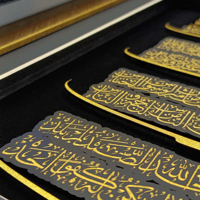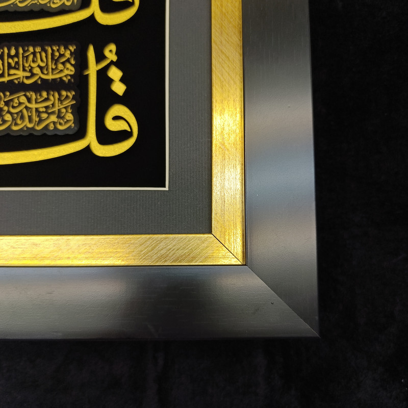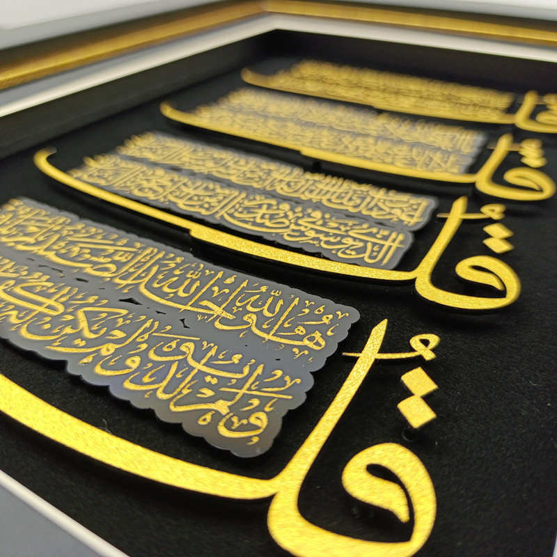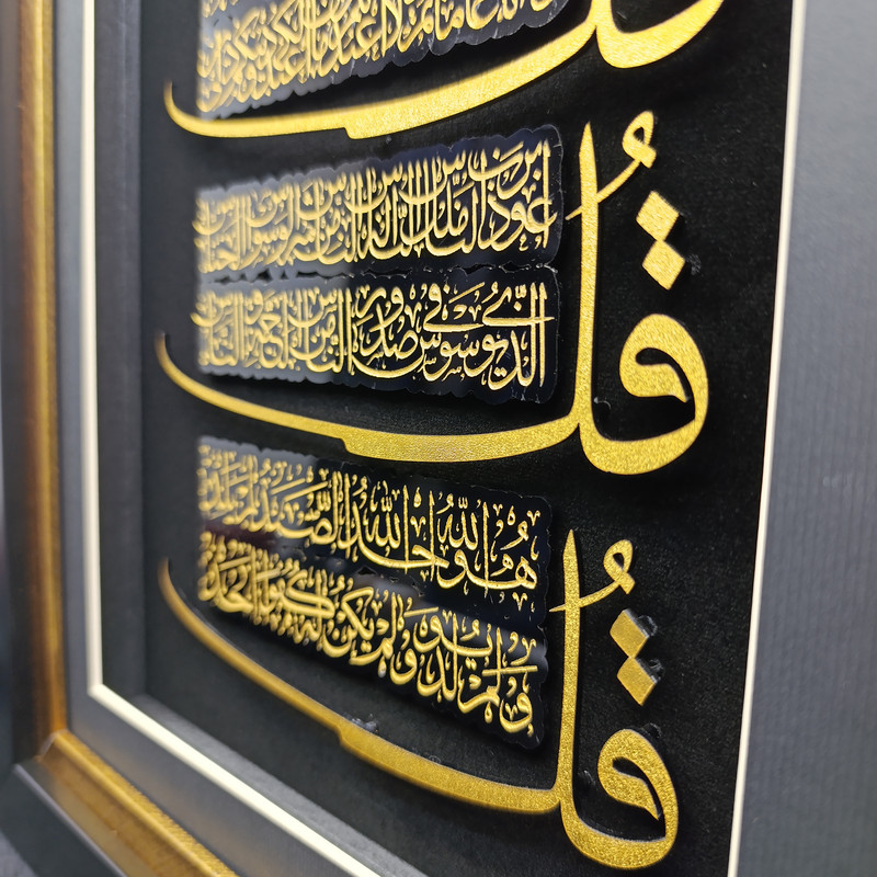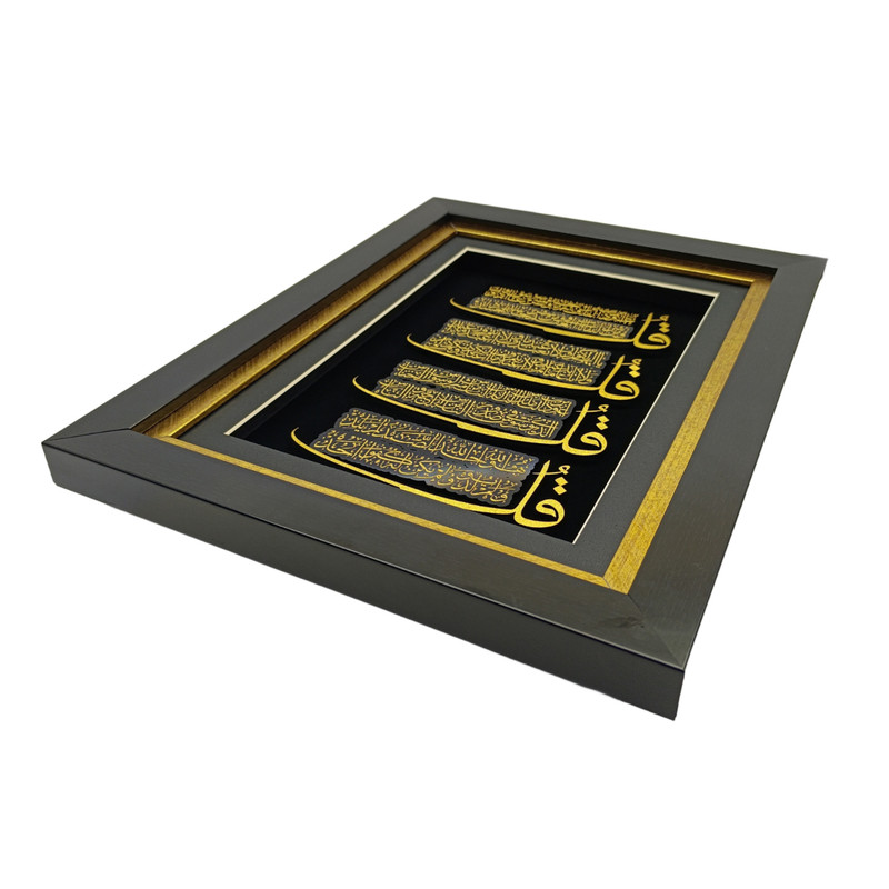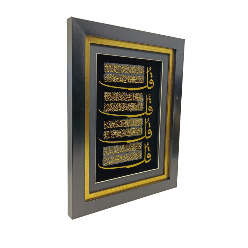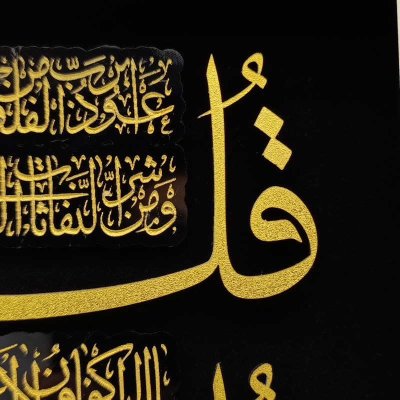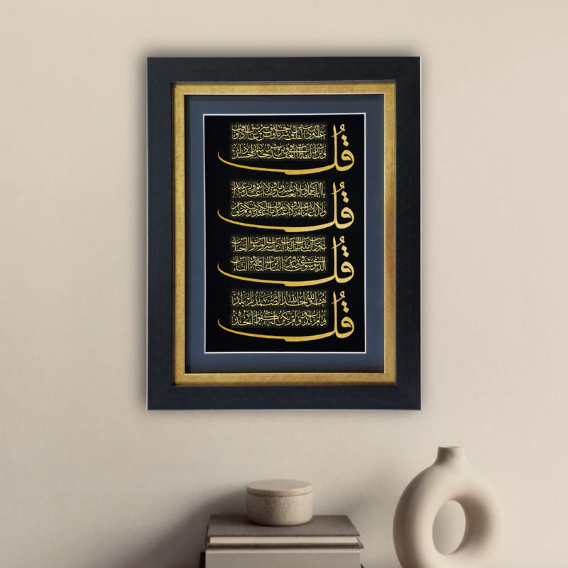 این اثر هنری زیبا، ترکیبی از معنویت و شکوه بصری است که با دقت و ظرافت ویژهای طراحی و ساخته شده است. متن چهار سوره شریفه قرآن، معروف به «چهار قل» (سورههای کافرون، اخلاص، فلق و ناس)، با ورق طلای درخشان بر زمینهای مشکی خوشخطی شده است. در سمت راست هر سوره، کلمه «قل» با خطی برجسته و طلایی نمایان است که جلوهای خاص به اثر بخشیده است.