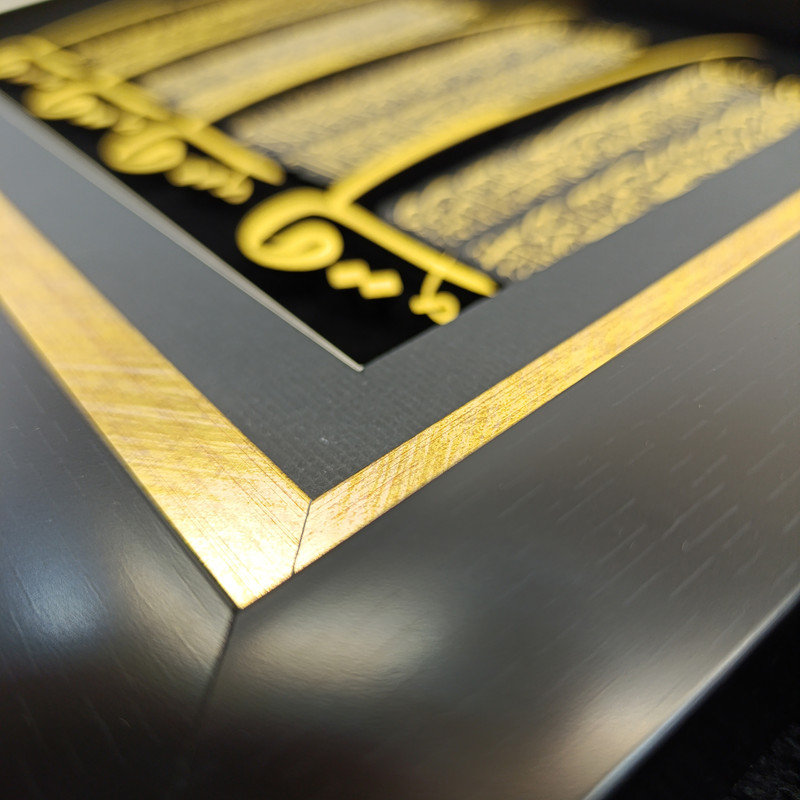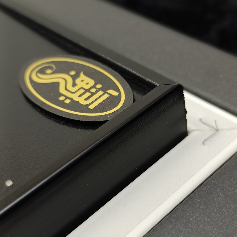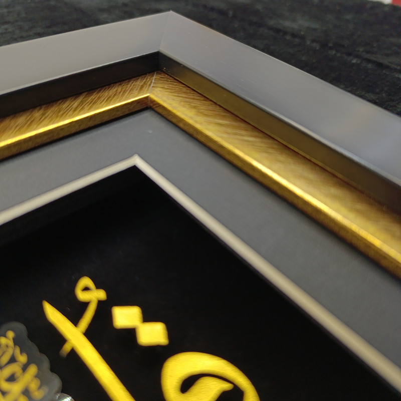 قاب این تابلو از جنس فایبرگلس محکم و سبک ساخته شده و با ترکیب رنگ مشکی و طلایی، هماهنگی کامل با نوشتههای طلاکوب ایجاد کرده است. لایههای داخلی قاب با رنگ طلایی مات و مشکی براق طراحی شدهاند که باعث برجستهتر شدن متن میشود.