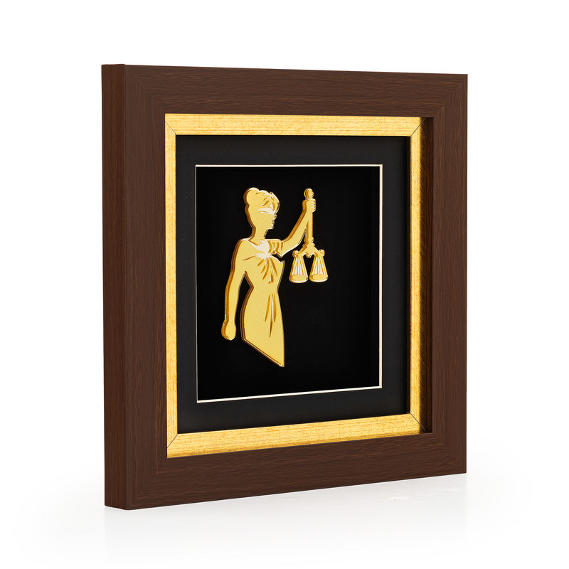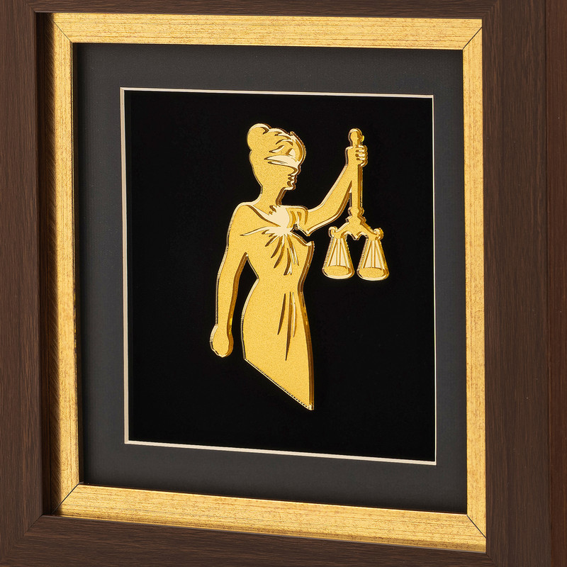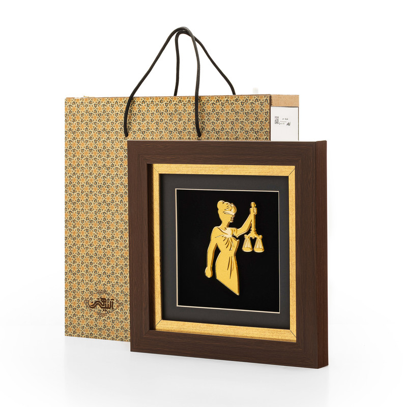 نماد ترازو در این تابلو، نشانهی عدالت و تعادل است. خطوط طراحی دقیق و متقارن بوده و نماد طلایی در مرکز، با ورق طلا و پرداخت نرم جلوهای فاخر ایجاد کرده است. قاب پیویسی مشکی–طلایی، تضاد بصری زیبایی به اثر بخشیده و باعث میشود تابلو هم در فضاهای کلاسیک و هم مدرن جلوهای چشمگیر داشته باشد.