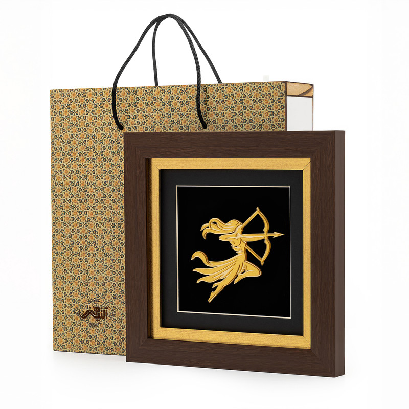 در تابلوی آذرماه، کماندار طلایی با حرکتی هدفمند و پویا، نماد آزادی و آرمانگرایی است. نماد از ورق طلا ساخته شده و طراحی آن با دقتی هندسی روی پسزمینهی تیره کار شده است. قاب پیویسی براق، تابلو را در برابر رطوبت و گردوغبار محافظت کرده و ماندگاری رنگها را تضمین میکند. این تابلو جلوهای از پویایی و قدرت ذهنی است که فضای هر خانه یا دفتر را خاصتر میکند.