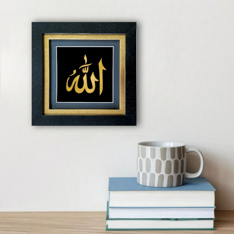 این اثر نفیس و چشمنواز، با ترکیب هنر خوشنویسی اسلامی و جلوهگری طلاکوب، نام مبارک «الله» را به شکلی باشکوه به تصویر کشیده است. نوشته با خط ثلث، که از زیباترین و پرابهتترین خطوط اسلامی به شمار میرود، روی زمینه مشکی بهوسیله ورق طلای درخشان کار شده و جلوهای معنوی و مجلل به فضا میبخشد.