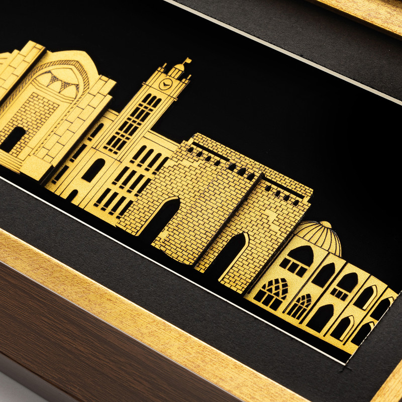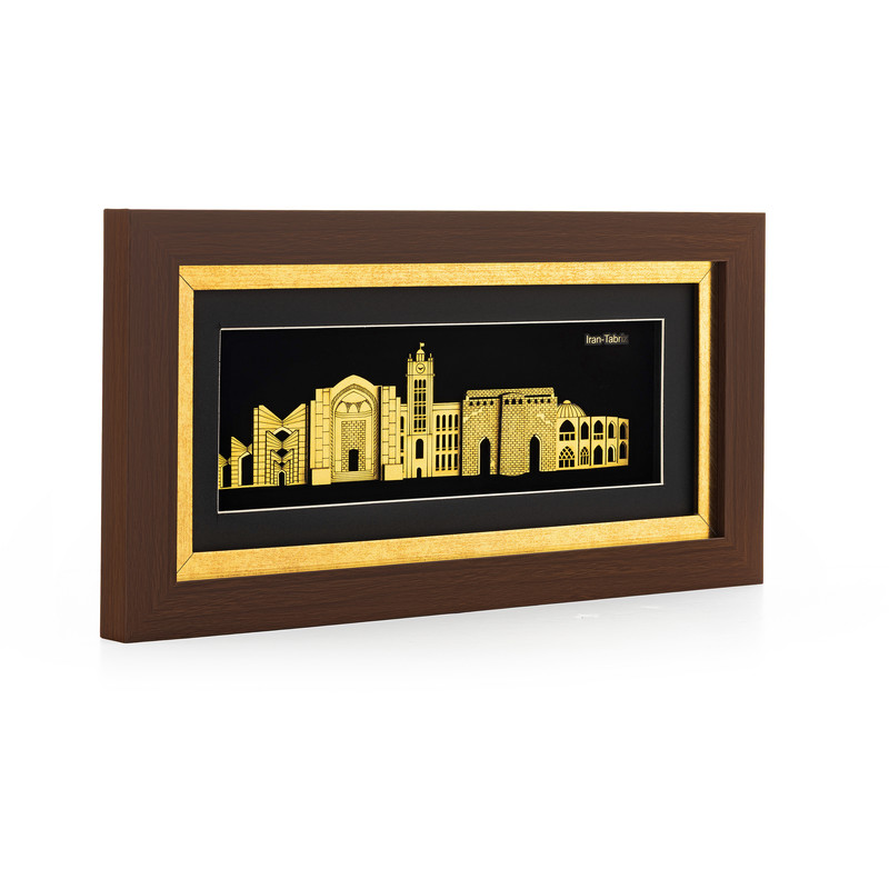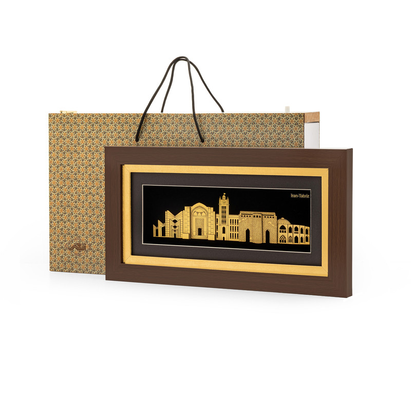 تابلوی پیش رو اثری ماندگار از هنر اصیل ایرانی است که با الهام از المانهای شاخص و تاریخی شهر تبریز طراحی شده است. در این اثر زیبا، بناهایی چون عمارت ساعت (ساختمان شهرداری تبریز)، مسجد کبود، مقبرهالشعرا و بازار تاریخی تبریز در کنار هم به تصویر کشیده شدهاند تا شکوه و عظمت این شهر کهن را در قالب یک قاب هنری جاودانه سازند. اجرای طلایی طرح بر زمینهای مشکی، جلوهای بینظیر از اصالت و وقار را به نمایش گذاشته و آن را به اثری شیک و چشمنواز برای هر فضای دکوراتیو تبدیل کرده است. این تابلو علاوه بر زیبایی بصری، نمادی از هویت فرهنگی و تاریخی آذربایجان شرقی و یادآور جایگاه مهم تبریز در تاریخ ایران است. هدیهای ارزشمند برای علاقهمندان به هنر، فرهنگ و معماری که میتواند زینتبخش خانه، دفتر کار و یا بهترین یادگار برای دوستداران این دیار باشد.