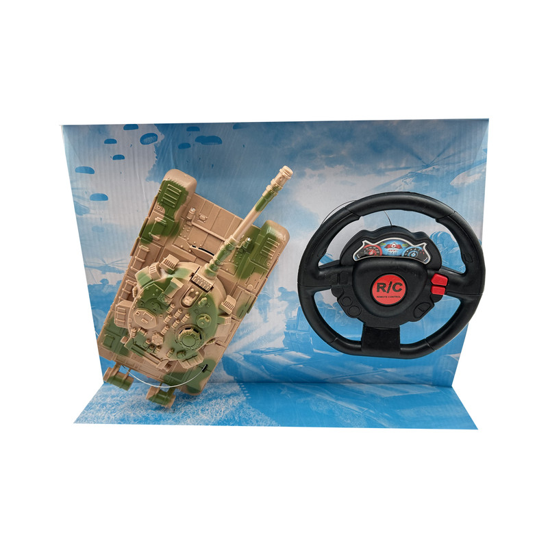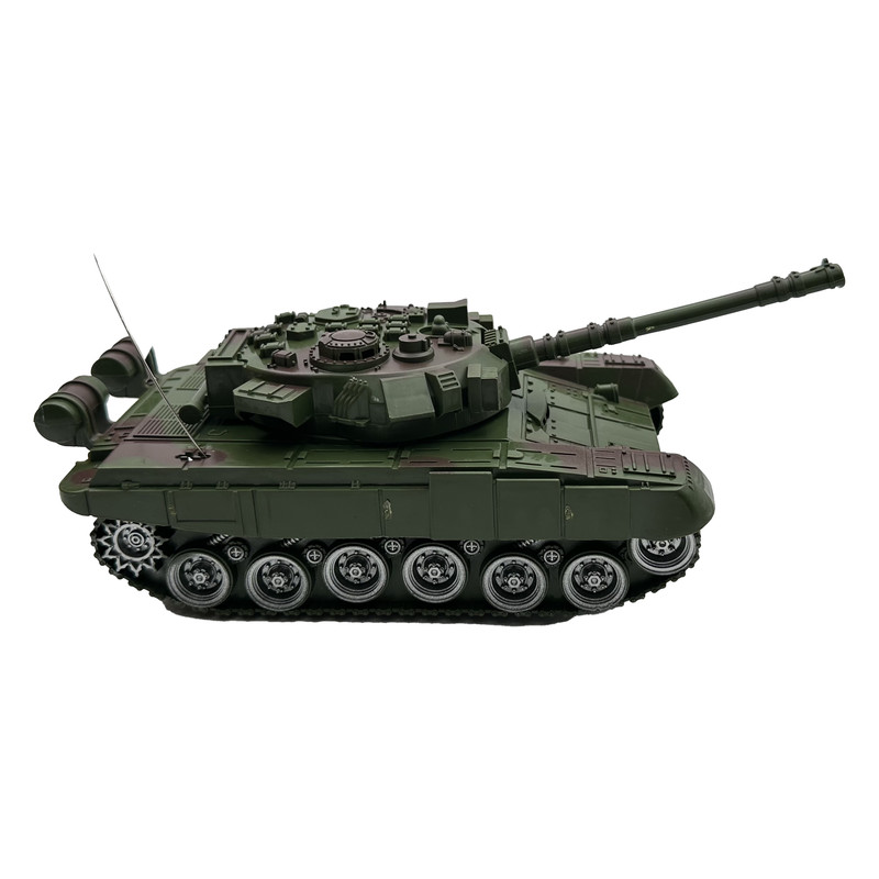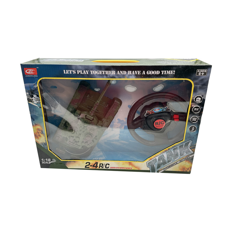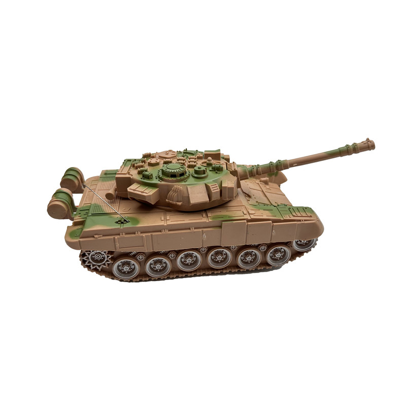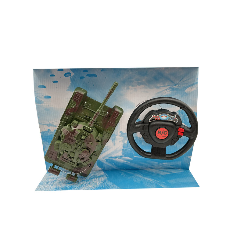 اسباب بازی تانک کنترلی که دارای ریموت کنترل بی سیم طرح فرمان 2 کانال (قادر به حرکت جلو و عقب) می باشد. این تانک کنترلی دارای طول حدود 24 سانتی متر و سایز 1:18 بوده و ساخت مناسبی می باشد.