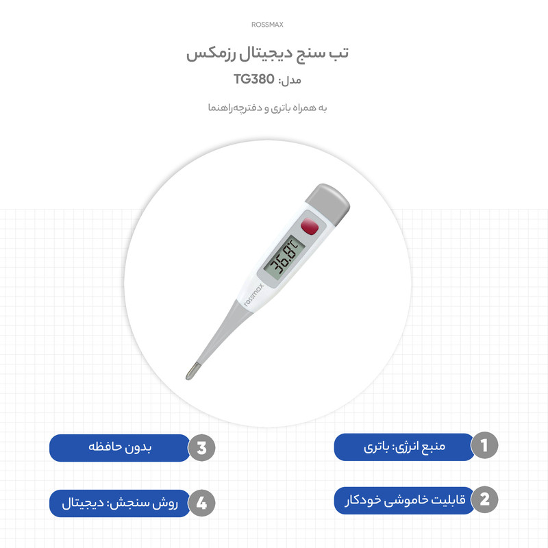 تبسنج «رزمکس» (Rossmax) مدل «TG380»، دماسنجی برای اندازهگیری دمای بدن، دارای سر منعطف و ضد آب است. سر تبسنج با قابلیت انعطاف بالایی که دارد، برای اندازهگیری دمای نقاط مختلف بدن مناسب است. از آن جایی که سر این تبسنج ضد آب است، میتوان آن را شست و با الکل ضدعفونی کرد. این تبسنج قابلیت اندازهگیری دما در محدوده 32 تا 42.9 درجهی سانتیگراد را دارد. دقت اندازهگیری تبسنج 0.1 درجه سانتیگراد است. دمای اندازهگیری شده با دو واحد سانتیگراد و فارنهایت روی صفحه، نمایش داده میشود. صفحهنمایش تبسنج از نوع دیجیتالی بوده که مصرف باتری پایینی دارد. روی صفحه علاوه بر دمای اندازهگیری شده، نشانگرهای دمای بیشتر یا کمتر از محدوده قابل اندازهگیری، نشانگر تعویض باتری و نشانگر خطا نشان داده میشوند. چنان چه دمای اندازهگیری شده از دمای طبیعی بدن یعنی 37.8 درجهی سانتیگراد فاصله داشته باشد، هشدار صوتی به صدا در میآید. این هشدار برای تب بالای 38 درجه و دمای زیر 37 درجه متفاوت است و با بوقهای متوالی یا ادامهدار مشخص میشود. انرژی تبسنج از یک عدد باتری دکمهای تأمین میشود که عمر آن برای 1500 بار استفاده، معادل دو بار اندازهگیری در روز در طول یک سال کفایت میکند. چنان چه پس از پایان اندازهگیری دما، تبسنج به حال خود رها شود، جهت جلوگیری از تخلیه ناخواسته باتری، پس از مدتی تبسنج به شکل خودکار خاموش میشود. هنگام ضعیف شدن باتری، نشانگر تعویض باتری روی صفحه نشان داده میشود. برای اینکه دقت تبسنج همواره در بهترین حالت باقی بماند، باید باتری ضعیف شده را فوراً تعویض کرد. به طور خلاصه تبسنج Rossmax TG380 دارای دقت اندازهگیری 0.1 درجهی سانتیگراد، محدوده اندازهگیری 32 تا 42.9، صفحهنمایش دیجیتال، هشدار صوتی و قابلیت خاموشی خودکار بوده و با سر منعطفی که دارد برای اندازهگیری دمای دهان، زیر بغل و مقعد مناسب است.