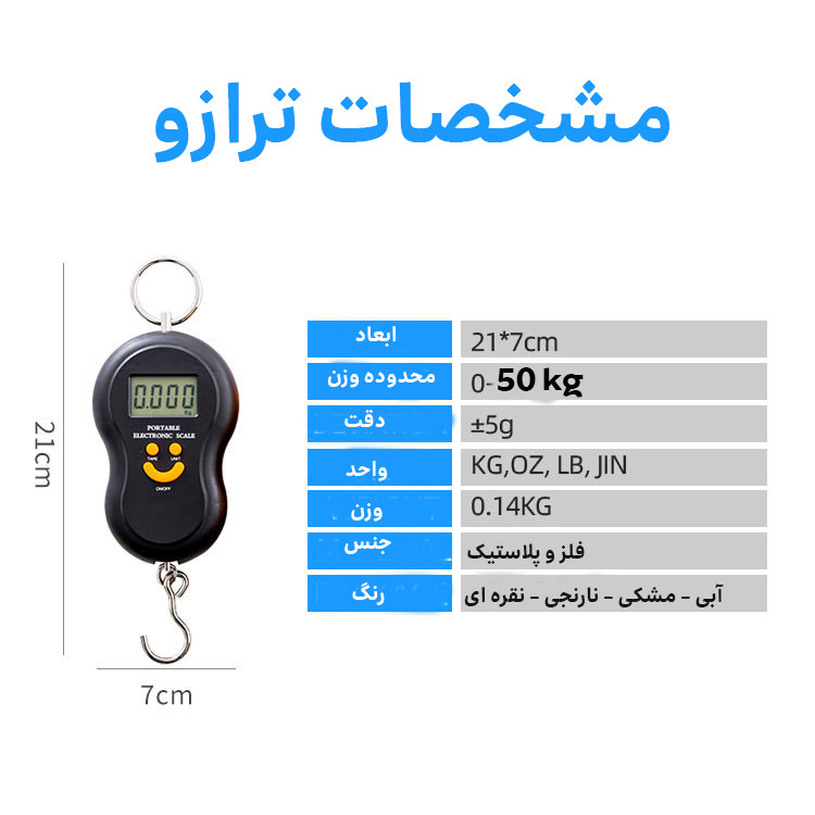 | سایر مشخصات | قابل وزن کردن تا 50 کیلوگرم. دارای 4 واحد کیلوگرم, اونس, پوند و جین. بسته بندی کارخانه شامل دو باتری نیم قلمی |