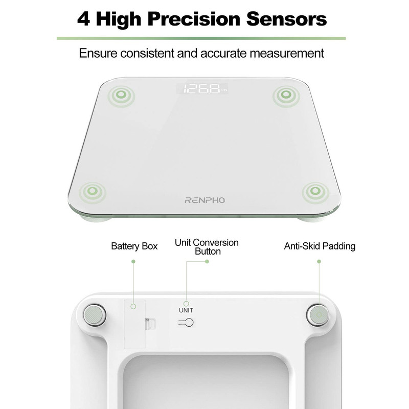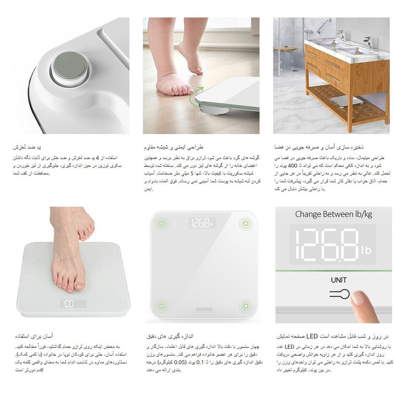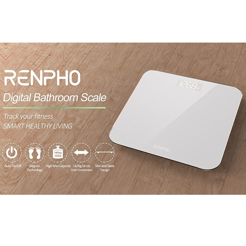 سایر توضیحاتهمیشه دقیق: ترازو دیجیتال حمام مجهز به 4 سنسور با دقت بالا، فوراً وزن دقیق را با ظرفیت 400 پوند (180 کیلوگرم) با افزایش 0.1 پوند (0.05 کیلوگرم) ارائه می‌کند و به شما امکان می‌دهد حتی تغییرات کوچک وزن خود را به دقت ردیابی کنید.این ترازو دیجیتال حمام Renpho دستیار خوبی است که به شما کمک می کند تا به راحتی و سریع به هدف تناسب اندام خود برسید. راه اندازی آن ساده است، استفاده از آن آسان است و طراحی کوچکتر جذابی دارد که برای هر فضایی ایده آل است. این ترازو خود را کالیبره می کند و به لطف نمایشگر LED روشن، کافیست روی ترازو گذاشته و عدد وزن خود را بلافاصله و واضح بخوانید. چهار سنسور وزن با دقت بالا با هم کار می کنند تا از اندازه گیری دقیق با درجه بندی 0.1 پوند / 0.05 کیلوگرم اطمینان حاصل کنند. کالیبراسیون خودکار: به سادگی با یک پا روی ترازو وزن بدن قدم بگذارید تا عملکرد کالیبراسیون خودکار آن را فعال کنید که نمایشگر را قبل از هر اندازه گیری به صفر می رساند. این امر دقت قابل اعتماد و ثابتی را با هر وزن کشی تضمین می کند. صفحه نمایش LED با خوانش آسان: اندازه گیری وزن را به وضوح با اعداد پررنگ و مشخص نشان می دهد و به شما امکان می دهد وزن خود را به سرعت و به راحتی در یک نگاه، حتی در محیط های کم نور بررسی کنید. ضروریات اصلی: لحظه ای که روی این دستگاه توزین دیجیتالی قدم می گذارید وزن بدن خود را فوراً دریافت کنید. گوشه‌های گرد، شیشه 5 میلی‌متری و ساختار متعادل، ایمنی را در اولویت قرار می‌دهند و آن را برای همه افراد به‌ویژه افراد مسن یا باردار ایده‌آل می‌سازند. سطح صاف آن امکان تمیز کردن و نگهداری آسان را فراهم می کند. ویژگی روشن/خاموش خودکار راحتی را افزایش می دهد. باتری کم و نشانه های بارگذاری بیش از حد باعث آرامش بیشتر در هنگام استفاده می شود. فضا کارآمد و براق: تنها با ابعاد 10.2x10.2x0.8 اینچ (26x26x2.1 سانتی متر)، ترازو Renpho برای وزن بدن، قرار دادن آن را آسان می کند و بدون زحمت در هر گوشه ای از حمام، اتاق خواب یا دفتر کار شما فرو می رود. طراحی باریک و مینیمالیستی به خوبی با دکوراسیون شما ترکیب می شود و حسی شیک به فضای شما می بخشد.