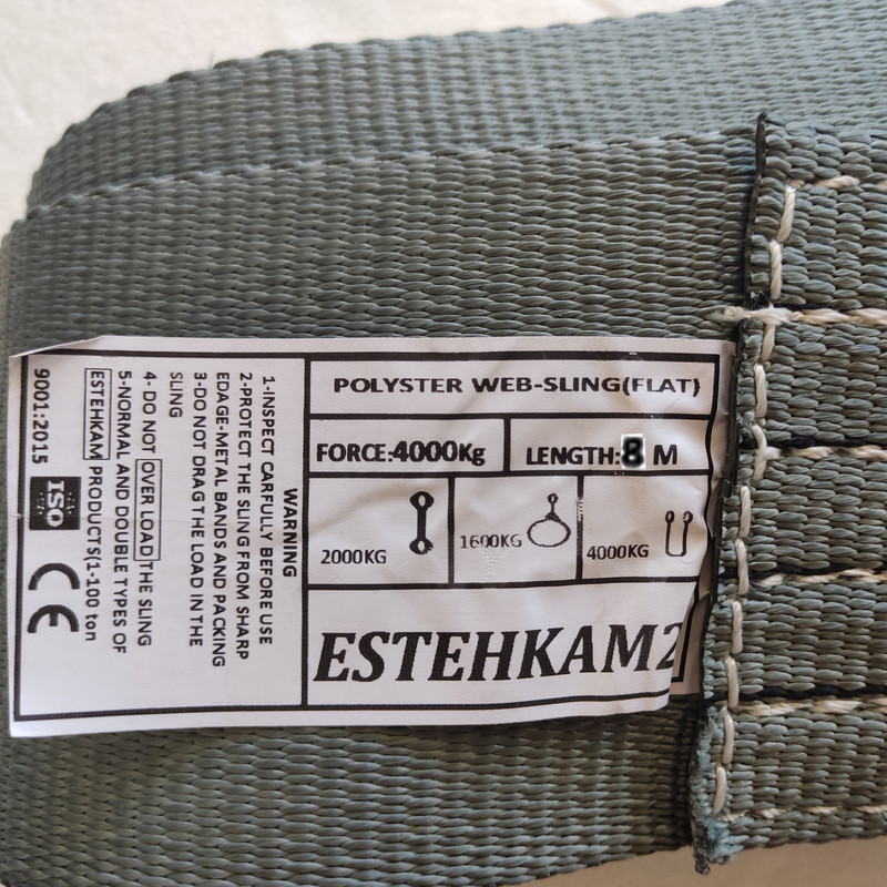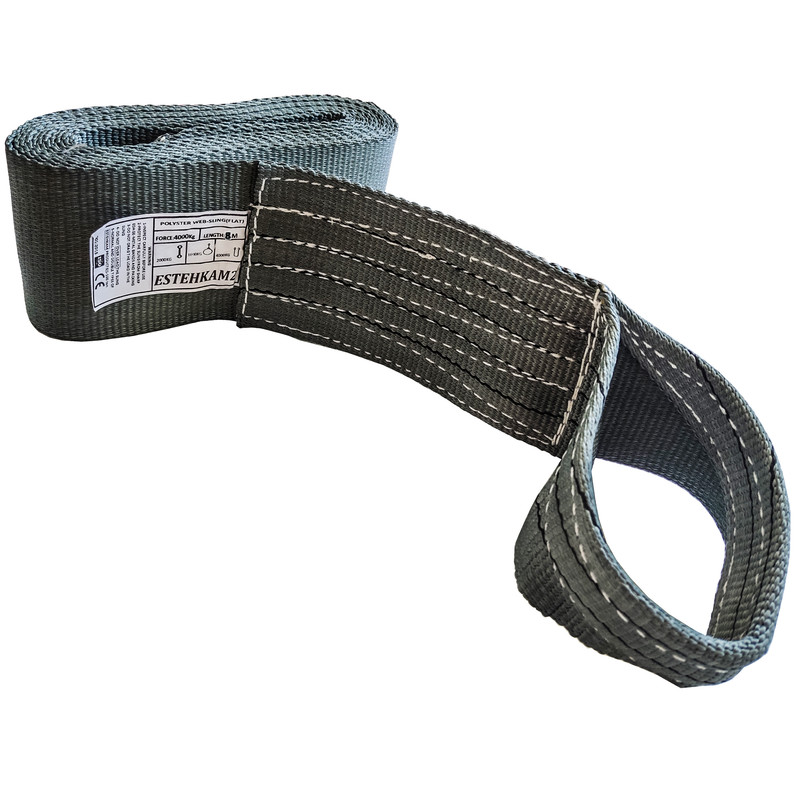 این محصول از جنس پلی استر بوده و عرض تسمه 10 سانتی متر می باشد. دو سر آن به صورت حلقه بوده و طول تسمه از سر یک حلقه تا سر حلقه دیگر 8 متر است که اگر حلقه ها را حساب نکنید 7 متر مفید میباشد. طول هر حلقه 20 سانتی متر است ولی اگر بخواهیم حلقه را به دور یک لوله یا جسم استوانه ای شکل بیاندازیم قطر استوانه مذکور حداکثر 40 سانتی متر می تواند باشد.تسمه فوق دولایه می باشد که این امر مقاومت آن را چند برابر می نماید به طوری که ضخامت تسمه چیزی حدود 5 تا 6 میلی تر است. قابليت تحمل وزن تسمه به صورت مستقيم 4 تن , به صورت U شکل 2 تن و به صورت دار حلقه 1600 کيلوگرم می باشد