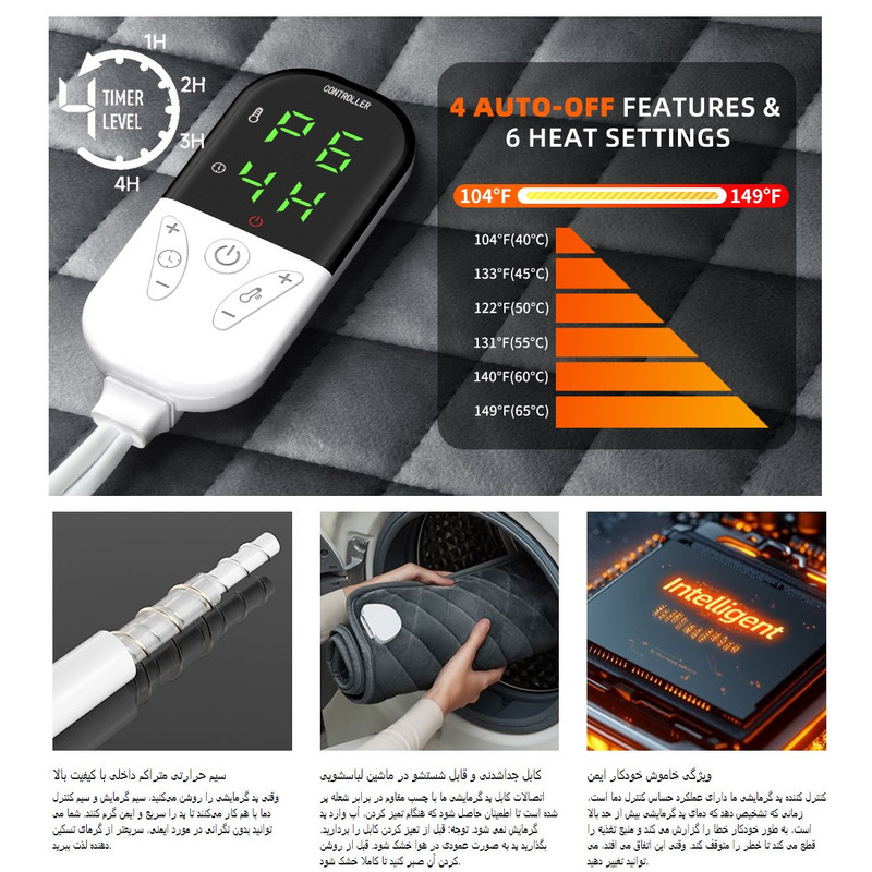 | سایر مشخصات | سبک وزن، خاموش شدن خودکار، محافظ در برابر گرمای بیش از حد، پد گرمایشی بزرگ، صرفه جویی در مصرف انرژی |