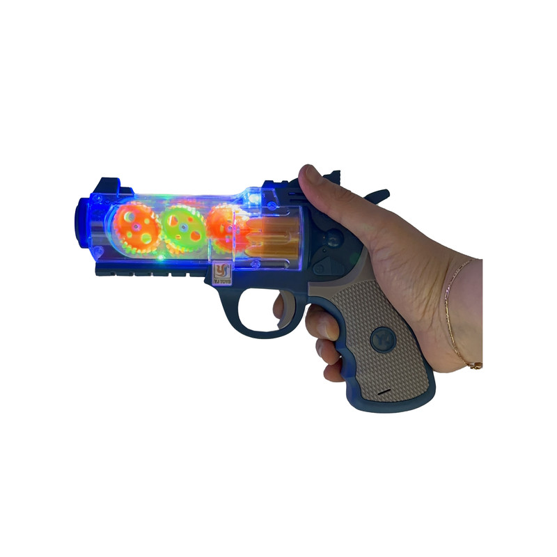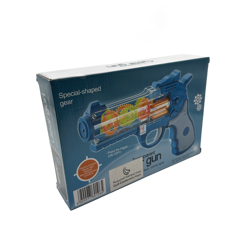 تفنگ اسباب بازی باطری خور مدل چرخدنده که با باطری قلمی کار می کند، با فشردن دکمه چراغ های آن روشن و همچنین چرخدنده های آن شروع به حرکت کرده و دارای صدای موزیکال و شلیک می باشد. دارای جعبه و مناسب کادو است.
