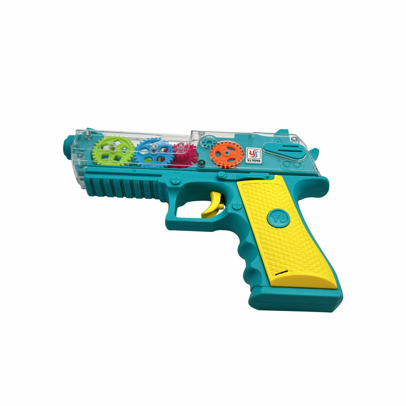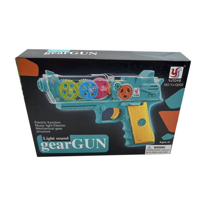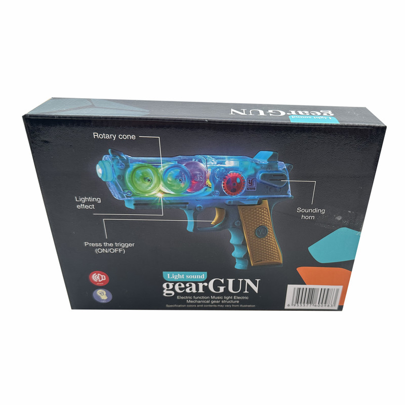 تفنگ اسباب بازی باطری خور مدل چرخدنده که با باطری قلمی کار می کند، با فشردن دکمه چراغ های آن روشن و همچنین چرخدنده های آن شروع به حرکت کرده و دارای صدای موزیکال و شلیک می باشد. دارای جعبه و مناسب کادو است.