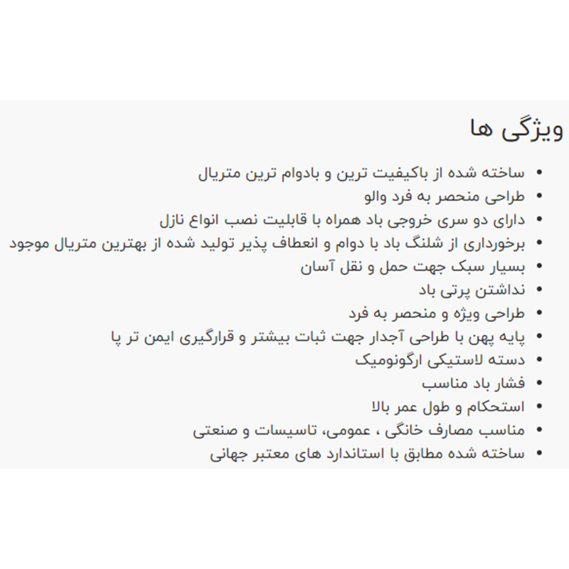 | سایر توضیحات | -پایه پهن با طراحی آجدار جهت ثبات بیشتر -شلنگ با دوام و انعطاف پذیر -وزن کم |