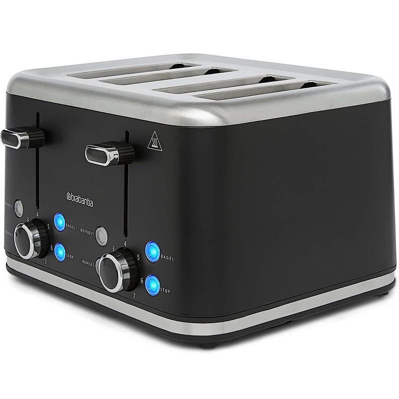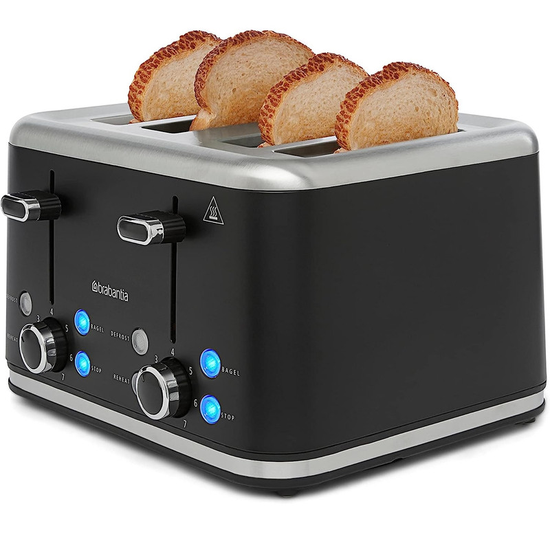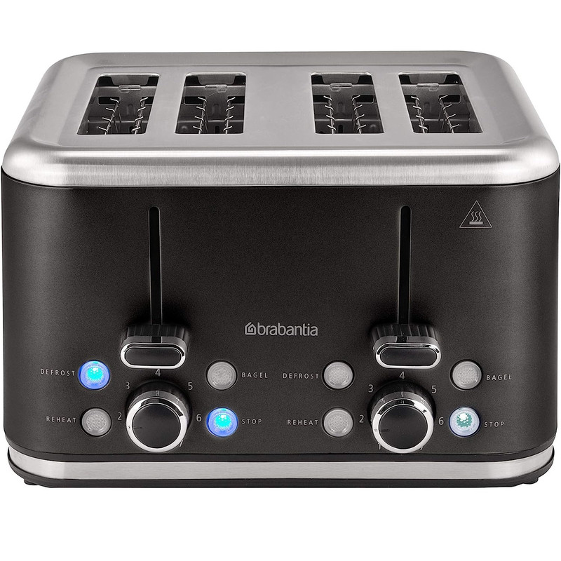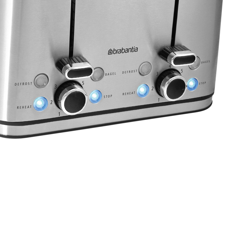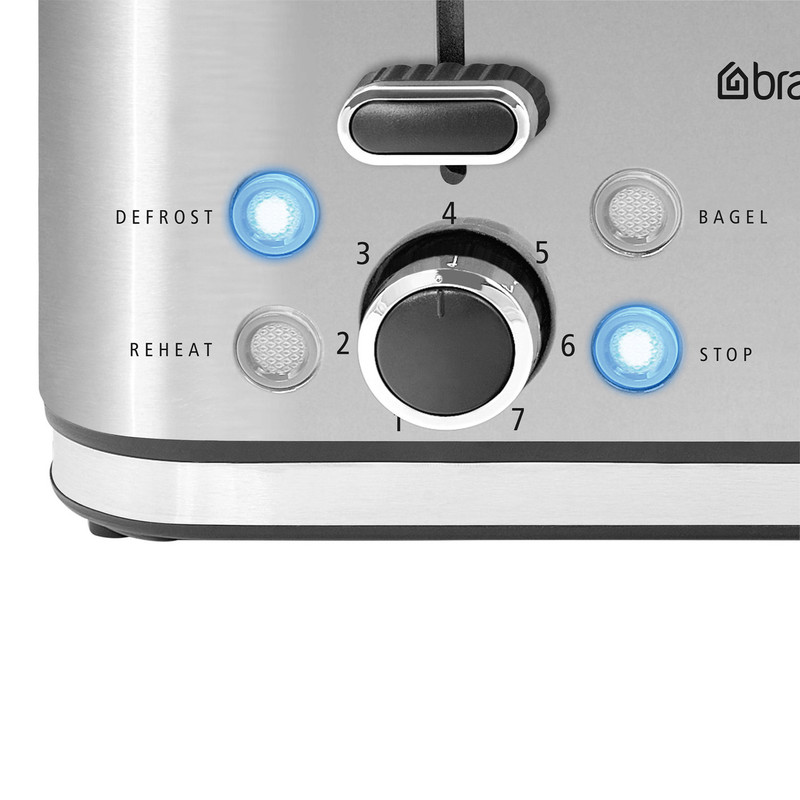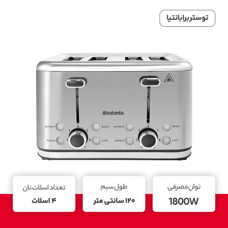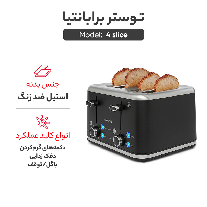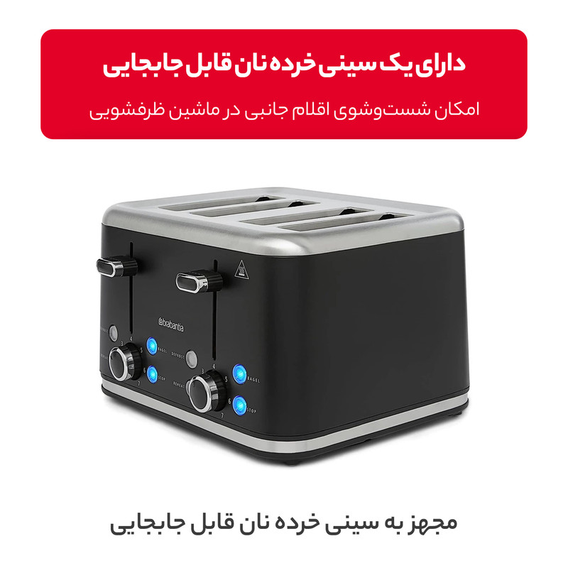 سایر توضیحات 1800 وات 4 اسلات برشته پهن محفظه استیل ضد زنگ دکمه‌های گرم‌کردن/دفک زدایی/باگل/توقف با چراغ‌های نشانگر LED 2 سینی خرده نان قابل جابجایی خود مرکزی به طور خودکار 2 کنترل قهوه ای متغیر 2 اهرم پاپ آپ عملکرد ضد جم