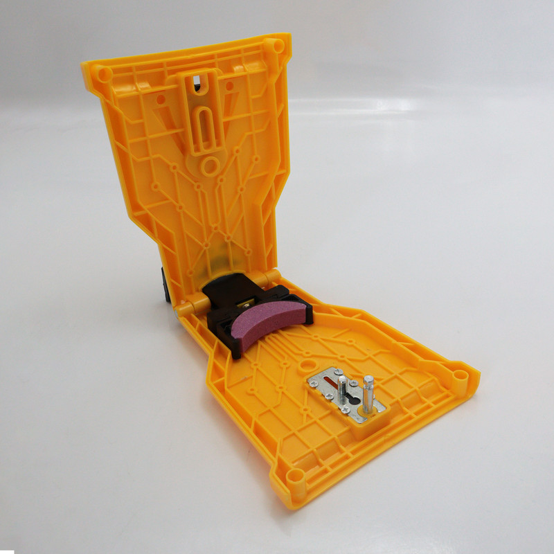 این وسیله برای تیز کردن زنجیر اره های زنجیری استفاده می گردد. نحوه عملکرد این وسیله به شکلی است که ابتدا توسط پایین کشیدن پین مشکی رنگ کشویی روی این ابزار، درب انرا باز میکنیم سپس ساطور را روی آن قرار میدهیم. در داخل خود وسیله یک عدد پین نقره ای رنگ دیده می شود. این وسیله بسته به نوع ضخامت ساطور استفاده می گردد و میتوان آن را کلا بیرون آورد و بدون آن فرایند تیز کردن را ادامه داد. سپس درب اره تیز کن را میبندیم. در انتهای اره تیز کن یک قیمت پلاستیکی T شکل آجدار میبینیم. با فشار دادن این قیمت به سمت پایین، سنگ نصب شدن روی آن باعث برخورد با زنجیر شده و نهایتا منجر به تیز شدن زنجیر می گردد. کارکرد این وسیله بسیار آسان می باشد و برای اره زنجیری هایی که سوراخ روی ساطور آنها 5 میلیمتر یا بیشترمی باشد، مناسب است.