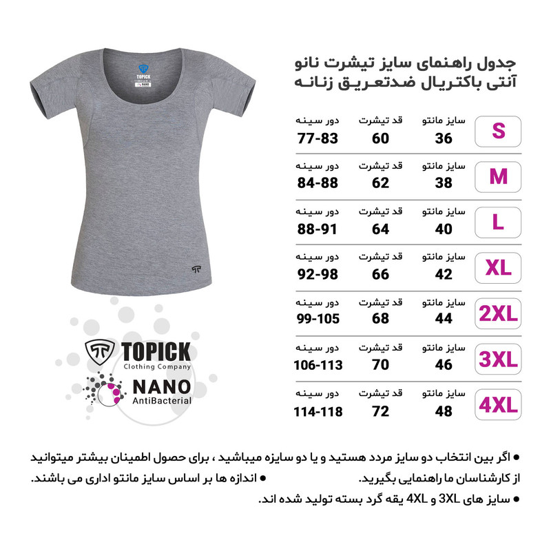 زیرپوش نانو آنتی باکتریال زنانه بصورت ضد باکتری و ضد تعریق و ضد لک و دارای لایه مـحافظ بسیار نازک با قابلیت جذب بسیار بالا و دارای تکنولوژی نانو برای از بین بردن بوی نامطبوع تا 95% میباشد وتماس پوست با زیرپوش 100% پنبه ای و ضدحساسیت رخ میدهد.
