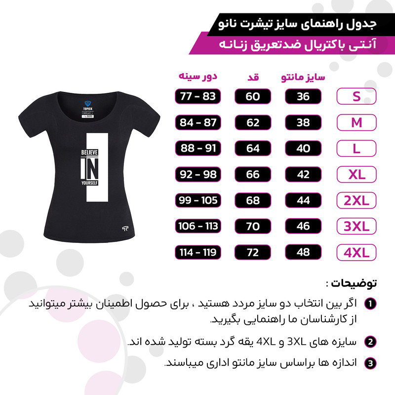 تیشرت نانو آنتی باکتریال ضدتعریق زنانه مشکی طرح believe ضد باکتری ضد تعریق ضد لک میباشد لایه مـحافظ بسیار نازک قابلیت جذب بسیار بالا دارای تکنولوژی نانو برای از بین بردن بوی نامطبوع تا 95% است تماس پوست با زیرپوش 100% پنبه ای و ضدحساسیت میباشد از سایز S تا 4XL است بکارگیری نانو در این محصول باعث کاهش شستشو، دوام البسه و حفظ آرامش و راحتی شما میشود با استفاده از فناوری نانو در عملیات تولید یا تکمیل پارچه، باکتری های بو زا نمیتوانند درون پارچه ها نفوذ کنند و در برخورد با مواد نانو از بین میروند.