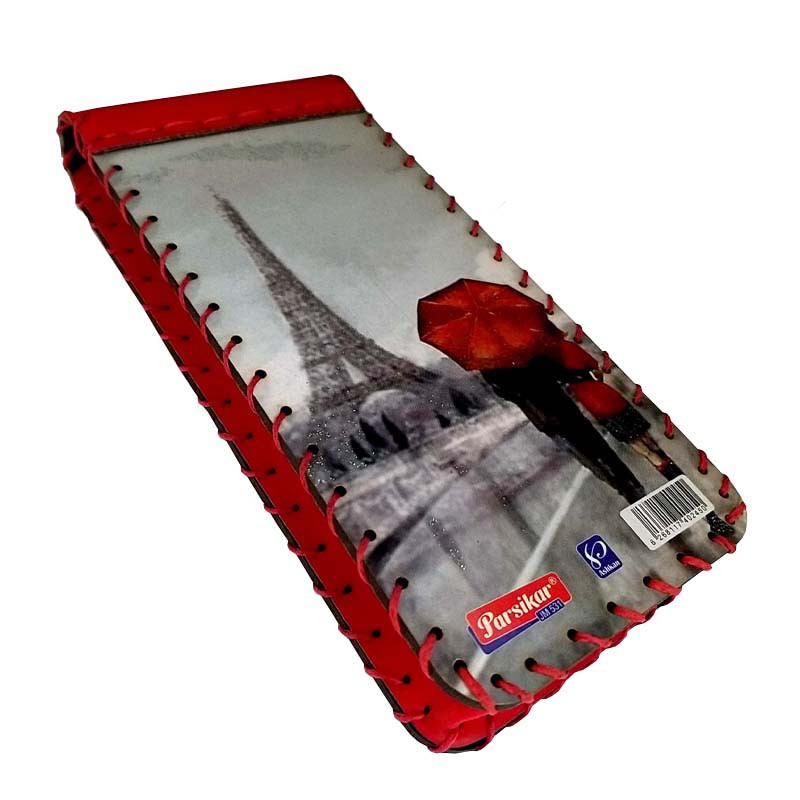 این جامدادی جا دار و دست دوز ، دارای بدنه از جنس چوب با طرحهای بسیار زیبا و چشم نواز است . جنس درب و اتصالات آن از چرم مصنوعی است و درب توسط قرار گرفتن یک بند به دور یک دکمه چوبی روی بدنه بسته می شود.
