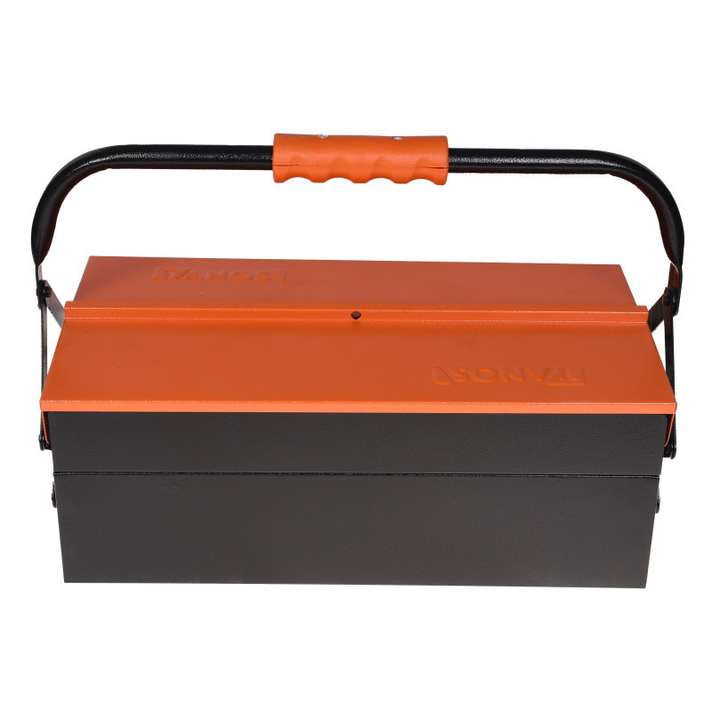 جعبه ابزار فلزی سه طبقه مدل AT_502 با رنگ بدنه مشکی و رنگ در های نارنجی تولید شرکت تانوس میباشد. طول این جعبه ابزار 50 سانتی متر، عرض آن در حالت بسته 22 سانتی متر و در حالت باز 50 سانتی متر است. این جعبه ابزار سه طبقه ( 1 طبقه کف ثابت و دو طبقه متحرک) فقط در ترکیب رنگی مشکی_نارنجی تولید میشود. حالت باز و بسته شدن این جعبه ابزار به صورت اتوماتیک است. ضخامت بالای ورقه آهنی و پرچ های محکم فولادی این کالا را به جعبه ابزاری با کیفیت و محکم تبدیل کرده است. جهت قرار دادن ابزارآلات ریز 3 عدد پالت پلاستیکی ( 1 بزرگ،2 کوچک) داخل آن تعبیه شده است و فضای کافی برای گذاشتن انواع ابزارآلات را داراست. دسته پلاستیکی ارگونومیک قرار داده شده باعث میشود هنگام حمل این جعبه ابزار احساس خستگی نکنید.همچنین رنگ ضد خش الکترواستاتیک روی بدنه از هر گونه رنگ پریدگی و خط و خش روی این جعبه جلوگیری میکند.