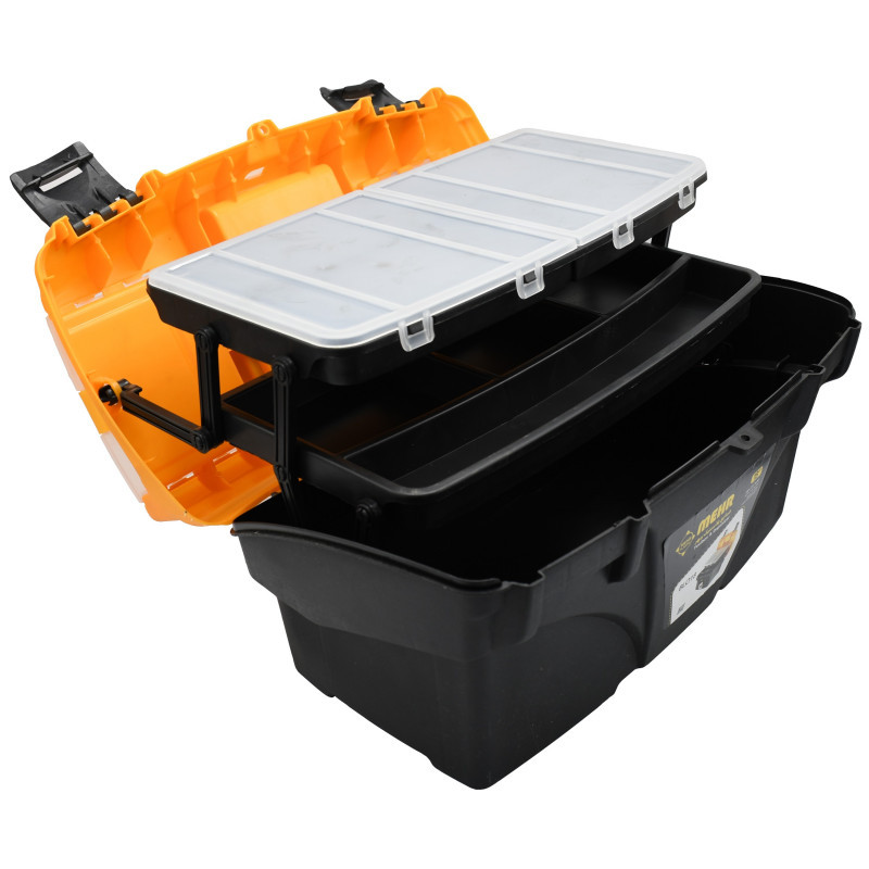 جعبه ابزار، محفظه، کیف یا جعبهای است که برای جانمایی، مرتب کردن، محافظت از ابزارها و حمل و نقل آنها به کار میرود. امروزه جعبه ابزارهای پلاستیکی و فلزی بیشتر مورد مصرف هستند و البته برای مشاغل تخصصی گوناگون، جعبه ابزارهای تخصصی نیز طراحی و ساخته شده است مانند جعبه ابراز باغبانی، جعبه ابزار الکترونیک، جعبه ابزار مکانیک و سایر تخصص ها و رشته ها. به این ترتیب، شاید بتوان به قطعیت گفت که جعبه ابزار، به یک وسیلهی ضروری برای هر مکان و هر شغل و موقعیتی تبدیل شده است.بسته به اندازه و تعداد محفظه های جعبه ابزار، در آن ابزارآلات دستی و برقیی مانند مینی فرز، چکش، میخ، انواع آچارها، پیچ گوشتی، انبردست، دم باریک، میخ، پیچ، مهره، واشر، مته و غیره قرار میگیرد. تمام این ابزار آلات و قطعات، به صورت منظم و در کنار هم درون محل های مشخص شده قرار میگیرند تا در هنگام نیاز، دسترسی بهتر و راحت تری را برای شخص فراهم کنند.محل های استفاده از جعبه ابزار، خانه، کارگاه، کارخانه، محل کار، داخل خودرو و سایر مکان هاست. کاربران، جنس بدنهی جعبه ابزارها را با توجه به محل و نوع استفاده از آن و نیز نوع حمل و نقل آن انتخاب می کنند. از جعبه ابزار پلاستیکی بیشتر در منزل و از جعبه ابزار فلزی، به دلیل مقاومت و استحکام آن، در بیرون از منزل و در محیط کار استفاده می شود.از موارد پراهمیت مد نظر خریداران جعبه ابزار، ظاهر آن و سپس جنس، استحکام، وزن، ظرفیت، تعداد قفسه ها و بخش ها و نیز برند آن است.جعبه ابزار مهر مدل BLO18 سایز 18 اینچ، از مواد اولیه پلاستیکی مناسب و باکیفیت تولید شده است و با وجود وزن 1800 گرمی خود، دارای استحکام و دوام قابل قبولی برای نگهداری و جابجایی ابزارآلات است.