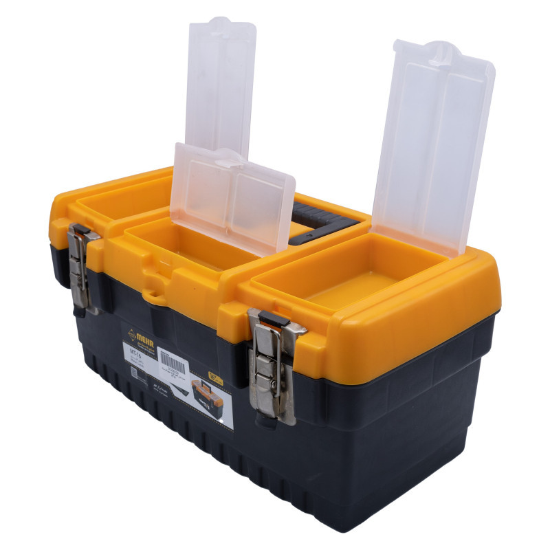 جعبه ابزار مهر مدل mt16، از جنس پلاستیک مقاوم و مرغوب ساخته شده که باعث شده تا وزن این جعبه ابزار پلاستیکی بسیار سبک باشد و بتوان به راحتی آن را حمل و جابهجا کرد.بر روی در این جعبه ابزار مهر پلاستیک، سه محفظهی کوچک قرار داده شده است که برای نگهداری ابزارآلات ریز مانند پیچ، میخ، مهره و... مناسب است.در داخل این جعبه، یک سینی دسته دار با 6 محفظه با سایزهای مختلف هست که فضای داخل جعبه را به دو طبقهی مجزا تقسیم میکند.