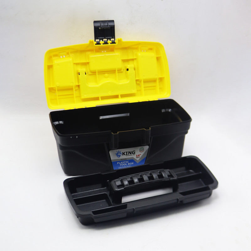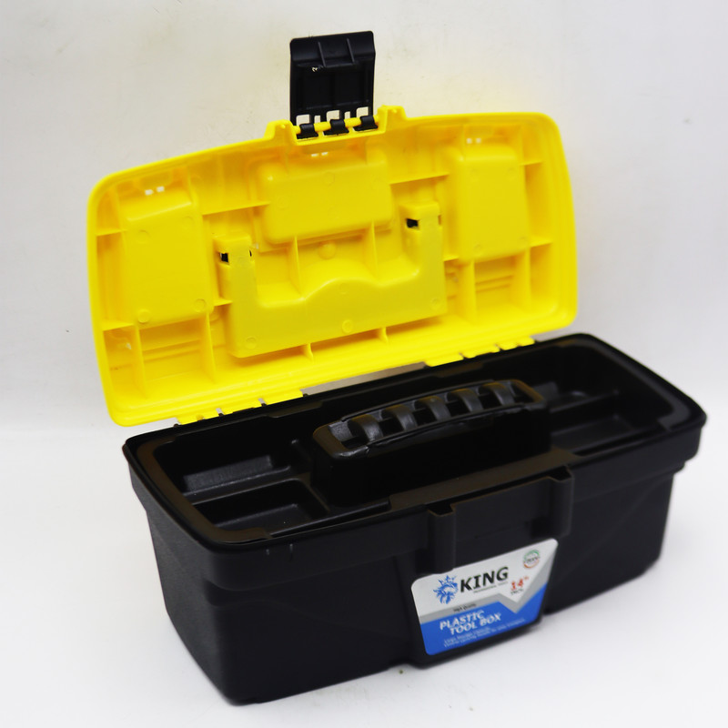 سایر توضیحات - جعبه ابزار کینگ - سایز 14 اینچ - دارای 3 محفظه روی در جعبه ابزار برای پیچ و میخ های کوچک و... - دارای یک محفظه بزرگ به طول 33*14 ( 7 خانه ) طبقه بالای جعبه ابزار - دارای 1 محفظه بزرگ به طول 33*14*12 سانتی متر برای قرار دادن ابزار بزرگ - جنس : با پلاستیک با مقاومت بالا - دارای دسته برای جابه جایی آسان - دارای قفل