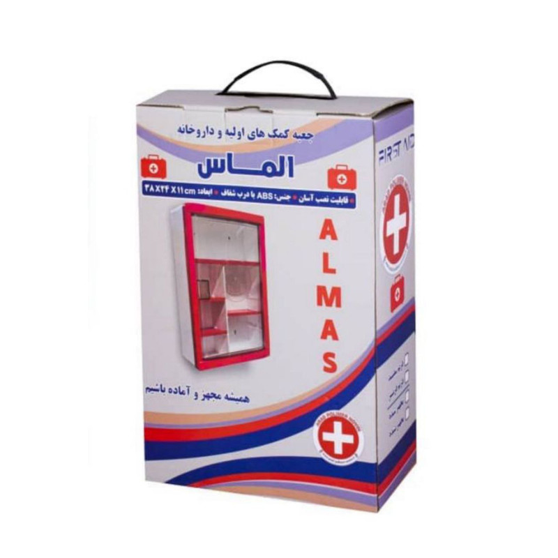 جعبه کمک اولیه دیواری الماس تولید شده از جنس abs میباشد این محصول قابلیت نصب به دیوار را دارد این محصول دارای محتویات به شرح زیر است: پنبه،محلول ضدعفونی،چسب زخم،باند دوربافت،باند کشی،گاز استریل و پد الکلی