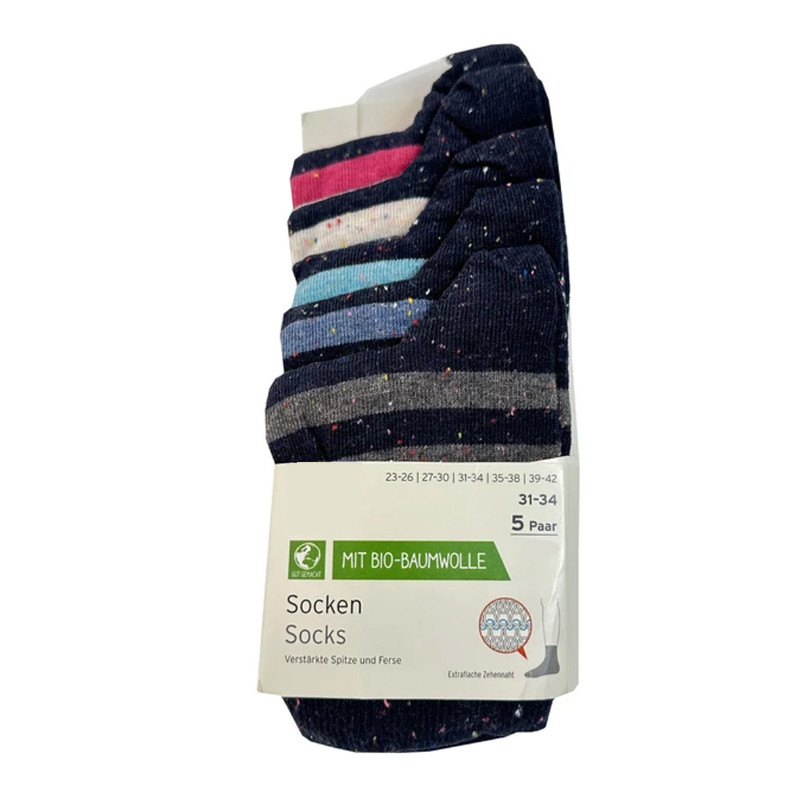 جوراب بچگانه 5 عددی تولید آلمان می باشد. این جوراب ها در رنگ های مختلف و در پک 5 عددی بفروش می رسد. قسمت پاشنه و نوک انگشتان جوراب ضخامت متفاوت و مقاوم تری دارد. این جوراب های آلمانی از 75 درصد نخ و 18 درصد پلی آمید و 6 درصد پلی استر تشکیل شده است. همچنین دارای مواد لاکرا جهت کشسانی بهتر و مقاومت در برابر پارگی می باشد.