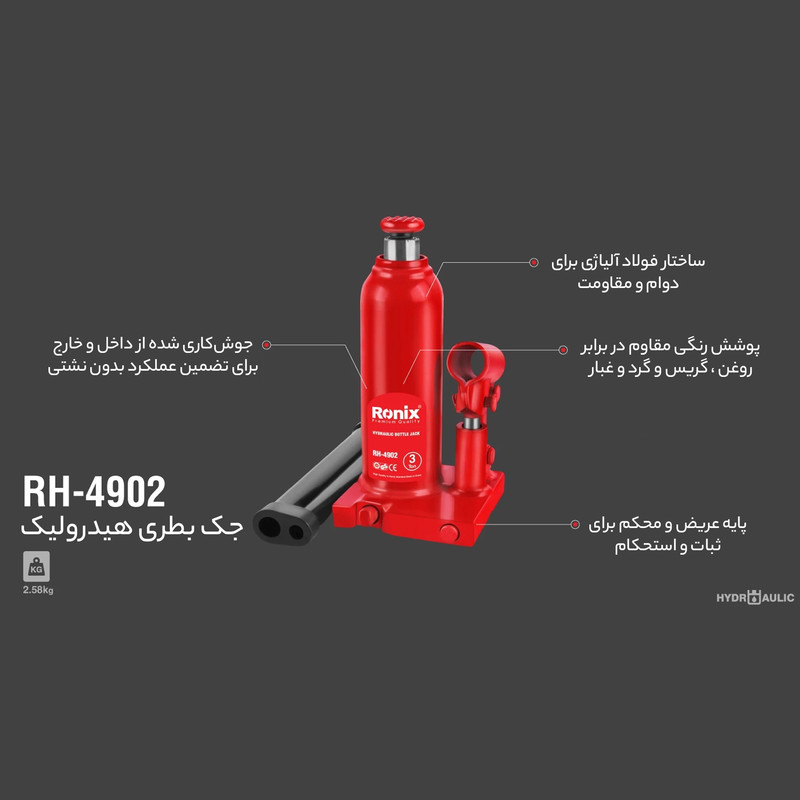 | سایر توضیحات | - جک هیدرولیک عمودی ثابت - دارای اهرم دو تکه برای باز کردن جک - اختلاف ارتفاع حالت جمع شده و بازشده (ارتفاع کاربردی جک) 178 میلیمتر - دارای پیچ افزایش دهنده ارتفاع در بالای جک به اندازهی 6 سانتیمتر - ابعاد: طول: 10 ، عرض: 9.5 ، ارتفاع: 19.4 سانتیمتر - ابعاد بسته بندی: طول: 11، عرض: 10، ارتفاع: 21 سانتیمتر - وزن بستهبندی: 3.6 کیلوگرم |