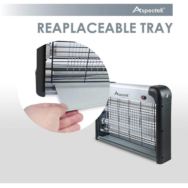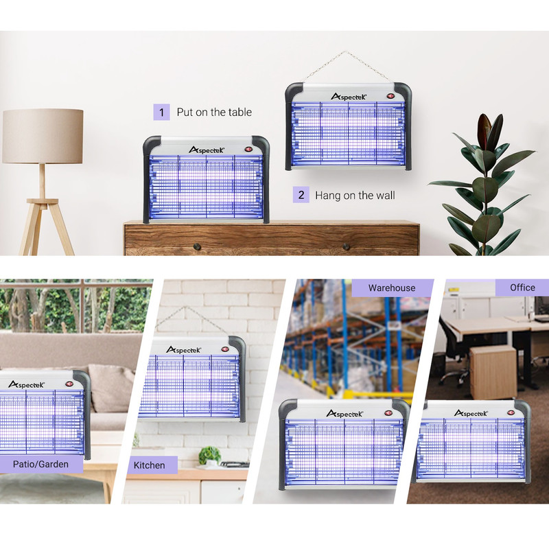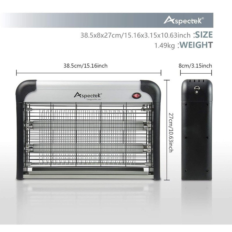 سایر ویژگی‌هاحشره‌کش Aspectek 20W، حشره‌کشی بی‌نظیر برای از بین بردن حشرات مزاحم: دستگاه دفع حشرات اسپکتک که مجهز به فناوری پیشرفته است، یک منبع نور UV قدرتمند را با یک شبکه الکتریکی ترکیب می‌کند تا حشرات پرنده را جذب و از بین ببرد. جذب و ریشه‌کنی فوری حشرات: این دستگاه دفع حشرات، طول موج ۳۶۵ نانومتر منتشر می‌کند که از نظر علمی ثابت شده است برای حشرات بسیار جذاب است، زیرا در محدوده طول موج طبیعی دید آنها قرار می‌گیرد. از آنجایی که مگس‌ها، پشه‌ها و هر حشره پرنده دیگری نمی‌توانند در برابر نزدیک شدن به منبع نور مقاومت کنند، بلافاصله دفع می‌شوند. شبکه قدرتمند ۲۸۰۰ ولت: این قوی‌ترین حشره‌کش موجود در بازار است. جرات کنید آن را با حشره‌کش‌های ضعیف‌تر و بی‌اثر رقبای ما مقایسه کنید. حشره‌کش Aspectek تضمین می‌کند که تمام آفات پرنده مضر را از بین می‌برد و شما را از صرف هزینه اضافی برای دافع حشرات یا سایر محصولات کنترل آفات حشرات باز می‌دارد. کنترل راحت آفات: دیگر خود و خانواده‌تان را در معرض مواد مضر قرار ندهید. این حشره‌کش برقی، جایگزین راحت و مفیدی برای کنترل آفات است و استفاده از آن در هر محیط داخلی با مشکل هجوم شدید آفات پرنده، ایمن است. ایده‌آل برای تمام محیط‌های داخلی: فوق‌العاده ایمن و مطمئن برای استفاده در هر فضای خانه و همچنین بیمارستان‌ها، محل‌های کار، فضاهای تجاری مانند آشپزخانه‌های رستوران‌ها، انبارها و فروشگاه‌های خرده‌فروشی. برای استفاده در فضای باز مناسب نیست نگهداری آسان: سینی پلاستیکی قابل جابجایی در پایین دستگاه، حشرات مرده را جمع آوری می‌کند و قابل شستشو است تا نگهداری سریع و ساده شود. شبکه برق خود تمیز شونده است.