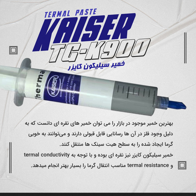 | سایر توضیحات | انتخاب بهترین خمیر سیلیکون از اهمیت بالایی برخوردار است. خیمرهای حرارتی باعث انتقال بهتر گرما و خنکتر ماندن پردازنده میشوند. استفاده از خمیر حرارتی مناسب تأثیر انکار نشدنی بر عملکرد پردانده دارد. |