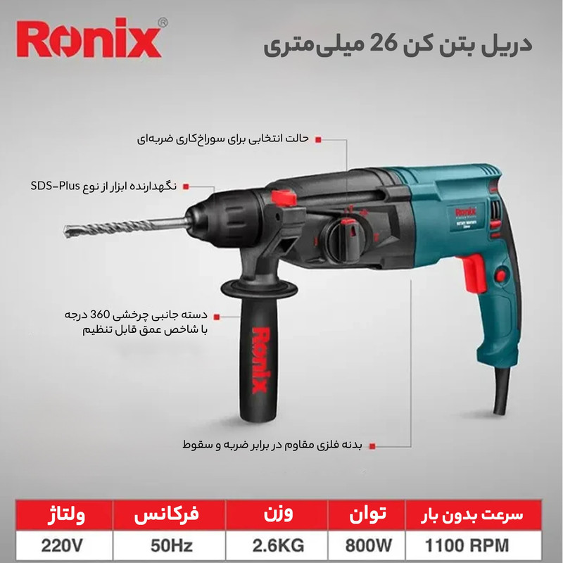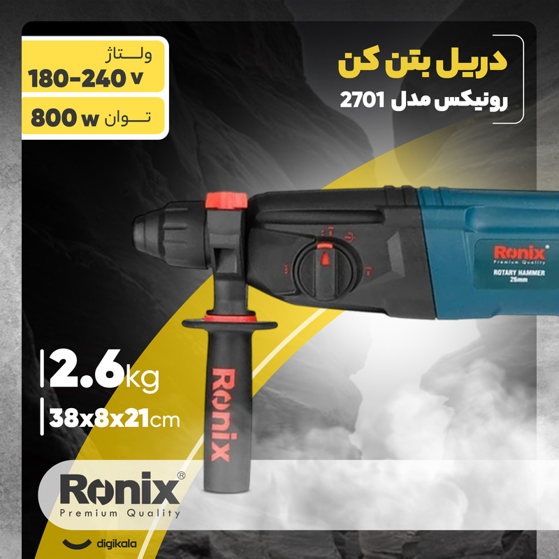 شرکت رونیکس Ronix با ارائه چندین مدل دریل بتن کن در کلاس ها و وزن های مختلف، انتخاب یک دریل بتن کن مناسب را برای مشتریان راحت تر کرده است. دستگاه پیش روی شما که جزو سبک ترین مدل های بتن کن و مناسب کارهای نصب در پروژه های ساختمانی میباشد مدل 2701 رونیکس است و با وزن 2.6 کیلوگرم و ابعاد 38 × 21 × 8 سانتیمتر، یک دریل بتن کن ضربهای با قدرت 800 وات است. سرعت این دریل در حالت بی باری تا 1100 دور بر دقیقه میرسد و دارای قابلیت کنترل سرعت است. این دستگاه هم برای مصارف خانگی و هم برای استفاده در کارگاههای ساختمانی و صنعتی بسیار مناسب است. این دریل توانایی سوراخکاری در چوب، فلز و بتون را دارد و حداکثر قطر سوراخ در این دستگاه در چوب، فلز و مصالح، به ترتیب 30، 13 و 26 میلیمتر است و برای تعویض مته نیازی به آچار ندارد و با ضامن موجود در گلویی دستگاه به سادگی انجام پذیر است. بتن کن 2701 از متریال درجه 1 و تحت استانداردهای روز اروپا توسط شرکت خوش نام رونیکس ساخته و به بازار ارائه گردیده است. از دیگر مزایای این دستگاه کلید چپ گرد راستگرد آن است که در انتهای دستگاه به گونه ای تعبیه گردیده که به سهولت از دو طرف دستگاه قابل تغییر است. .علاوه بر این، برخلاف مدلهای دیگر که کلید چپگرد راستگرد آنها روی شاسی دستگاه نصب شده است از مقاومت بالایی برخوردار است.