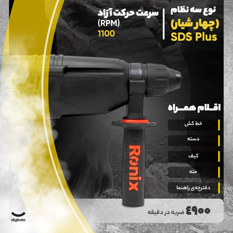 | سایر توضیحات | توان ضربه دستگاه 3 ژول دارای قابلیت کنترل سرعت با کلید فشاری با کیفیت ضد غبار تحت استانداردهای TUV و CE سبک و کم حجم جهت حداکثر تسلط حین کار مجهز به سیستم ابزار گیر چهار شیار (SDS Plus) دارای سه قابلیت عملکرد سوراخ کاری، سوراخ کاری چکشی و تخریب مجهز به بلبرینگ های ضد غبار NSK ژاپن دارای دسته کمکی با روکش نرم و با قابلیت چرخش 360 درجه مجهز به کابل 3 متری نرم و با کیفیت تحت استاندارد VDE آلمان دارای مته های الماسه در سایزهای 6 و 8 و 10 و قلم نوک تیز و تخت طراحی کاملا ارگونومیک و شکیل با کیفیت بالا و ساخته شده از متریال درجه 1 استفاده از روکش لاستیکی بر روی دسته ها جهت راحتی کاربر کلید چپگرد راستگرد با طراحی منحصر به فرد و مقاوم دارای محل تعبیه شده جهت آویز دستگاه مجهز به سیستم کروی اتصال کابل به دستگاه جهت جلوگیری از قطعی کابل در کار مداوم دارای نویز کم 102 دسیبل دستگاه عمق سنج، متههای مختلف با اندازههای 7×150 ، 8×150 ، 10×150 ، 12×200 ، دسته جانبی طراحی رونیکس |