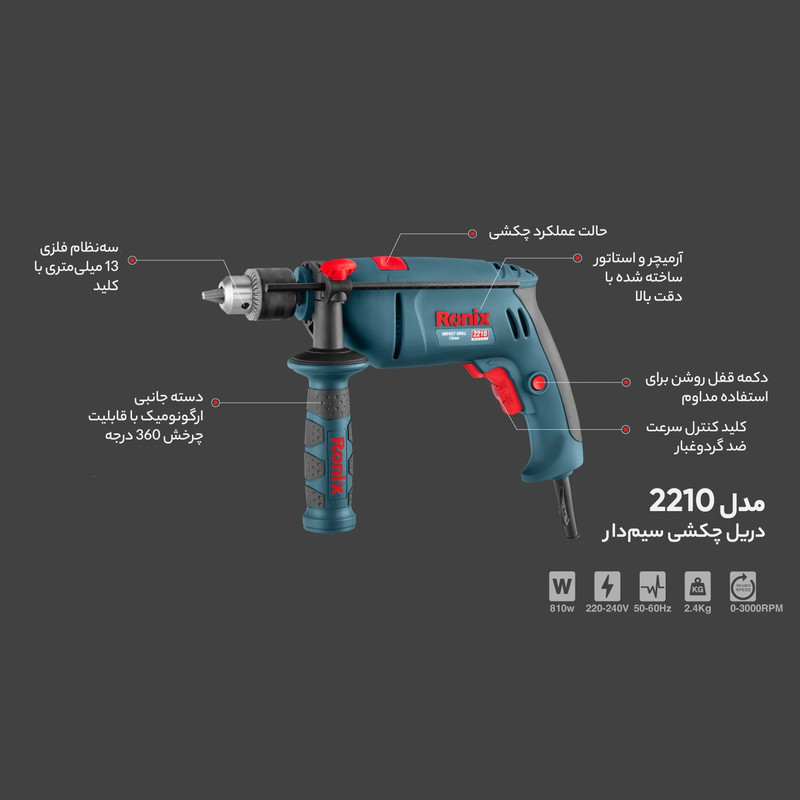 | ویژگیهای دریل | سیستم گردش تکجهت , سیستم گردش چپگرد , سیستم گردش راستگرد , قابلیت کنترل سرعت , قفل سوییچ , سیستم ضربه زن |