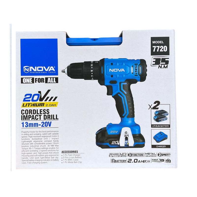 دریلهای شارژی به دلیل ویژگیهای منحصر به فرد خود، به یکی از ابزارهای پرکاربرد در صنایع مختلف و حتی مصارف خانگی تبدیل شدهاند. با توجه به نیاز روزافزون به ابزارهایی که قابلیت حمل و نقل آسان، قدرت بالا و عملکرد چندکاره داشته باشند، دریلهای شارژی به انتخاب اول بسیاری از حرفهایها تبدیل شدهاند. دریل شارژی 13 میلیمتری 20 ولت مدل 7720 نووا ، یک ابزار حرفهای و قدرتمند می باشد که برای استفادههای طولانی مدت و کارهای سنگین طراحی شده است. این دریل با موتور قدرتمند 20 ولتی، توانایی بالایی در سوراخکاری و پیچبندی در سطوح مختلف مانند چوب، فلز و پلاستیک دارد. این دستگاه به گونهای طراحی شده که در شرایط کاری پرفشار عملکرد بهینه داشته باشد. سهنظام اتوماتیک صنعتی 13 میلیمتری آن، امکان تعویض سریع متهها را فراهم میکند و سیستم کلاچ 19 حالته، کنترل دقیقتری در هنگام کار با پیچها و سطوح مختلف به کاربر میدهد.