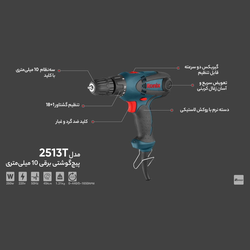 | سایر توضیحات | این محصول تحت عنوان مدل (2513T) در بازار موجود است. وزن این دریل پیچ گوشتی 1.3 کیلوگرم است و منبع تغذیه آن برق است. ولتاژ ورودی آن 220 ولت است و قابلیت کنترل سرعت گردش آزاد بین 0 تا 440 و همچنین 0 تا 1650 دور بر دقیقه را دارد. این دستگاه دارای مشخصاتی از قبیل قابلیت تنظیم گشتاور در 18+1 حالت مختلف، لامپ LED در حال کار بودن دستگاه و دکمه کم و زیاد کردن سرعت است. حداکثر قطر سوراخکاری در چوب و فلز این دستگاه بهترتیب 26 و 10 میلیمتر است. دریل پیچ گوشتی رونیکس همچنین مجهز به قلابی مخصوص برای آویزان کردن دستگاه است. طول کابل برق این ابزار 2 متر است و سه نظام آن قابل تنظیم برای انواع متههای 1 تا 10 میلیمتری است. دریل پیچ گوشتی رونیکس با مدل 2513T گزینه مناسبی برای افرادی است که به دنبال محصولات با کیفیت هستند. |
